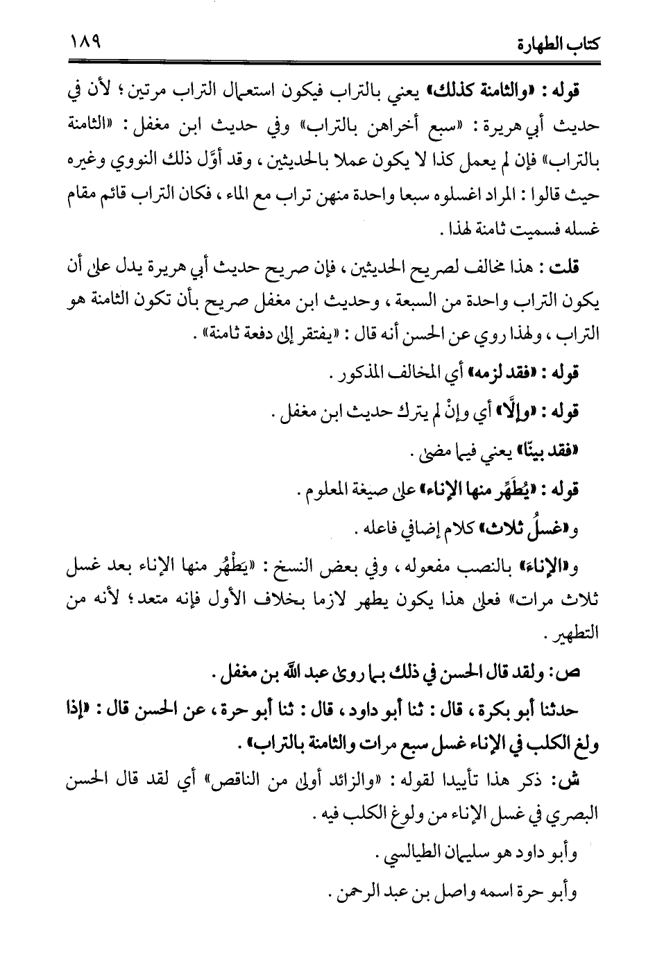 حدثنا أبو بكرة، قال: ثنا أبو داود، قال: ثنا أبو حرة، عن الحسن قال: "إذا ولغ الكلب في الإناء غسل سبع مرات والثامنة بالتراب".