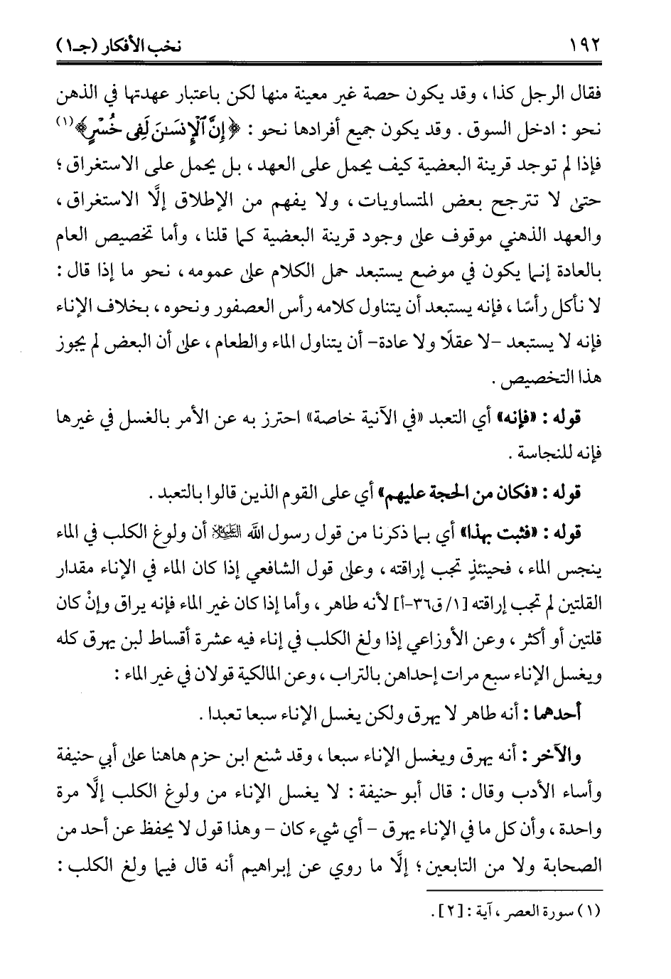 فقال الرجل كذا، وقد يكون حصة غير معينة منها لكن باعتبار عهدتها في الذهن نحو: ادخل السوق. وقد يكون جميع أفرادها نحو: {إِنَّ الْإِنْسَانَ لَفِي خُسْرٍ} (¬1) فإذا لم توجد قرينة البعضية كيف يحمل على العهد، بل يحمل على الاستغراق؛ حتى لا تترجح بعض المتساويات، ولا يفهم من الإطلاق إلَّا الاستغراق، والعهد الذهني موقوف على وجود قرينة البعضية كما قلنا، وأما تخصيص العام بالعادة إنما يكون في موضع يستبعد حمل الكلام على عمومه، نحو ما إذا قال: لا نأكل رأسًا، فإنه يستبعد أن يتناول كلامه رأس العصفور ونحوه، بخلاف الإناء فإنه لا يستبعد -لا عقلًا ولا عادة- أن يتناول الماء والطعام، على أن البعض لم يجوز هذا التخصيص.