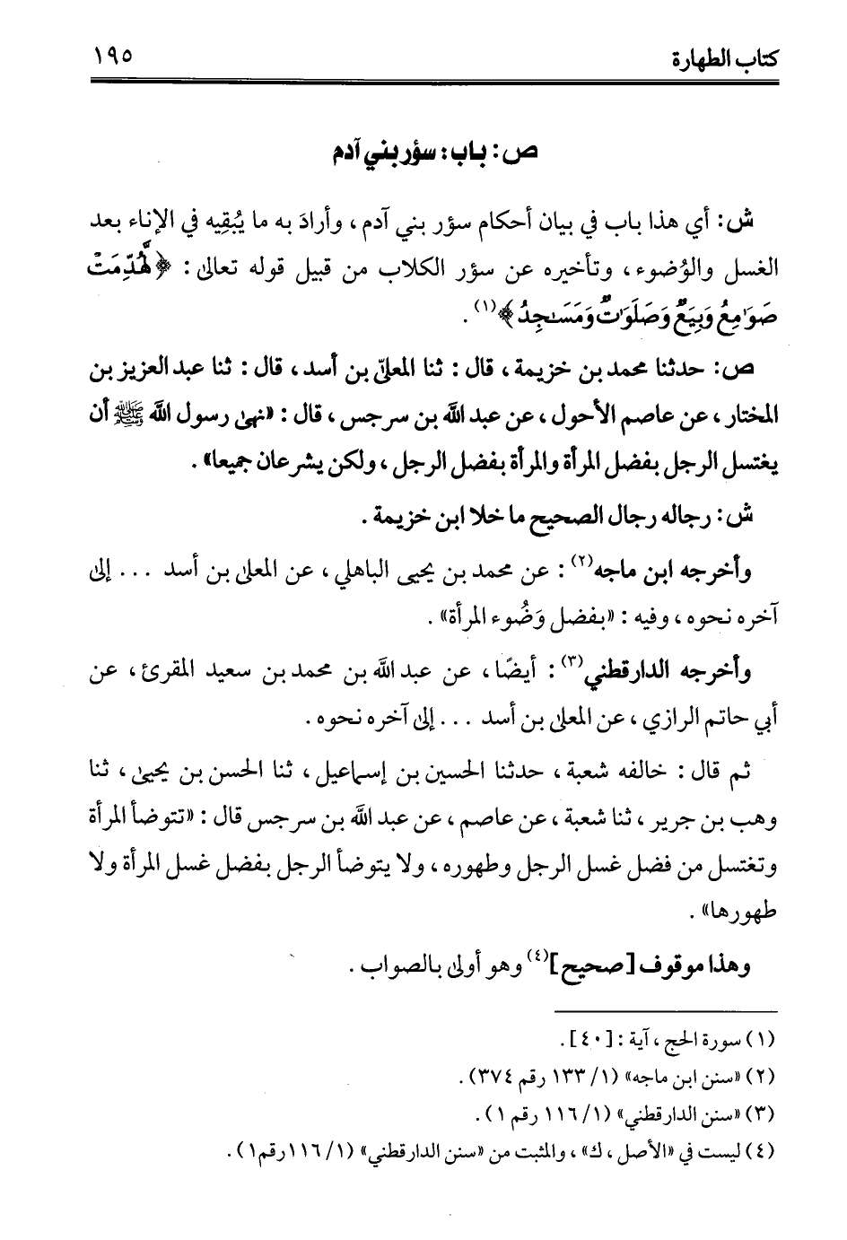 ص: حدثنا محمَّد بن خزيمة، قال: ثنا المعليّ بن أسد، قال: ثنا عبد العزيز بن المختار، عن عاصم الأحول، عن عبد الله بن سرجس، قال: "نهى رسول الله - صلى الله عليه وسلم - أن يغتسل الرجل بفضل المرأة والمرأة بفضل الرجل، ولكن يشرعان جميعا".