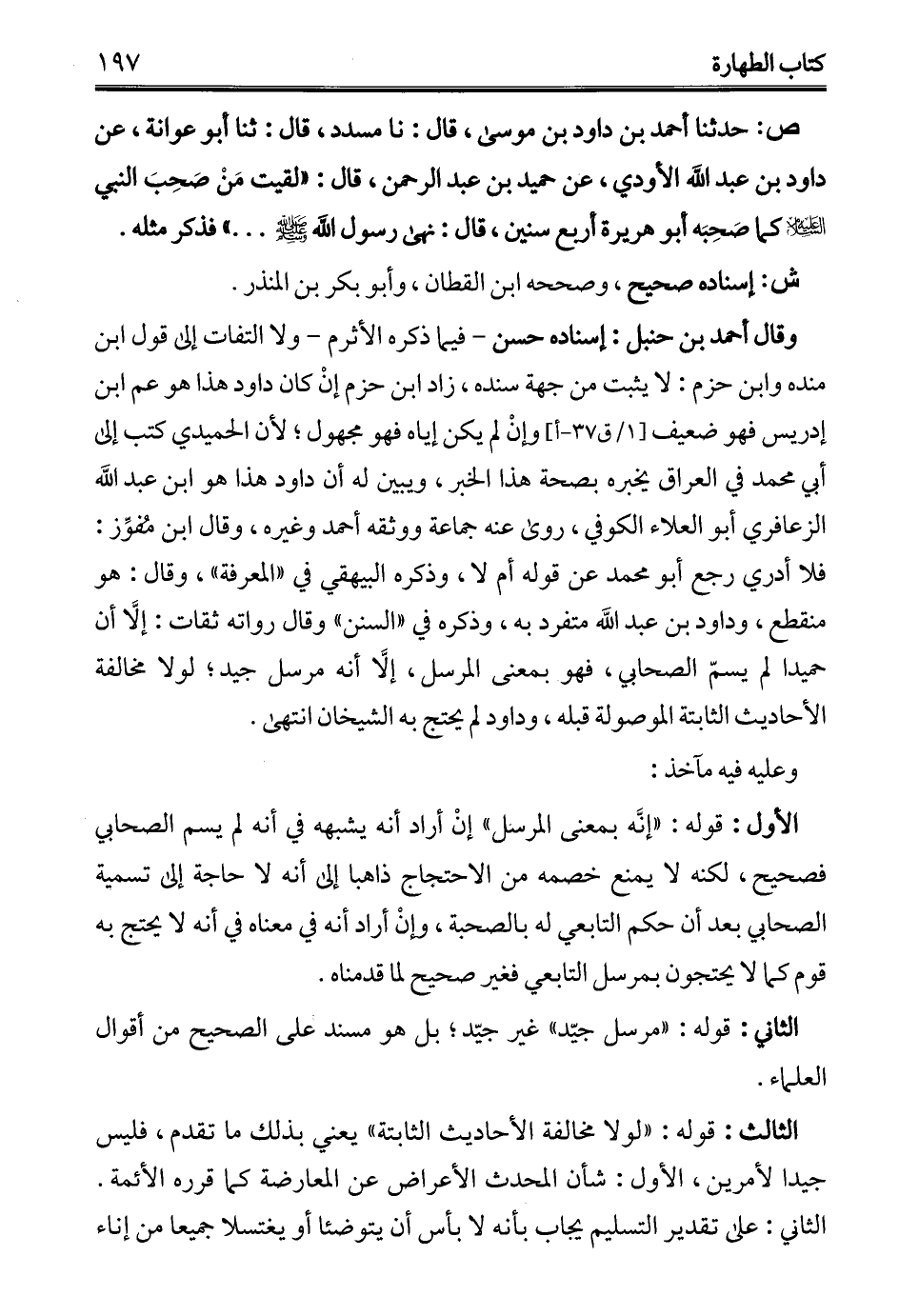وقال أحمد بن حنبل: إسناده حسن -فيما ذكره الأثرم- ولا التفات إلى قول ابن منده وابن حزم: لا يثبت من جهة سنده، زاد ابن حزم إنْ كان داود هذا هو عم ابن إدريس فهو ضعيف وإنْ لم يكن إياه فهو مجهول؛ لأن الحميدي كتب إلى أبي محمَّد في العراق يخبره بصحة هذا الخبر، ويبين له أن داود هذا هو ابن عبد الله الزعافري أبو العلاء الكوفي، روى عنه جماعة ووثقه أحمد وغيره، وقال ابن مفُوِّز: فلا أدري رجع أبو محمَّد عن قوله أم لا، وذكره البيهقي في "المعرفة"، وقال: هو منقطع، وداود بن عبد الله متفرد به، وذكره في "السنن" وقال رواته ثقات: إلَّا أن حميدا لم يسمّ الصحابي، فهو بمعنى المرسل، إلَّا أنه مرسل جيد؛ لولا مخالفة الأحاديث الثابتة الموصولة قبله، وداود لم يحتج به الشيخان انتهى.