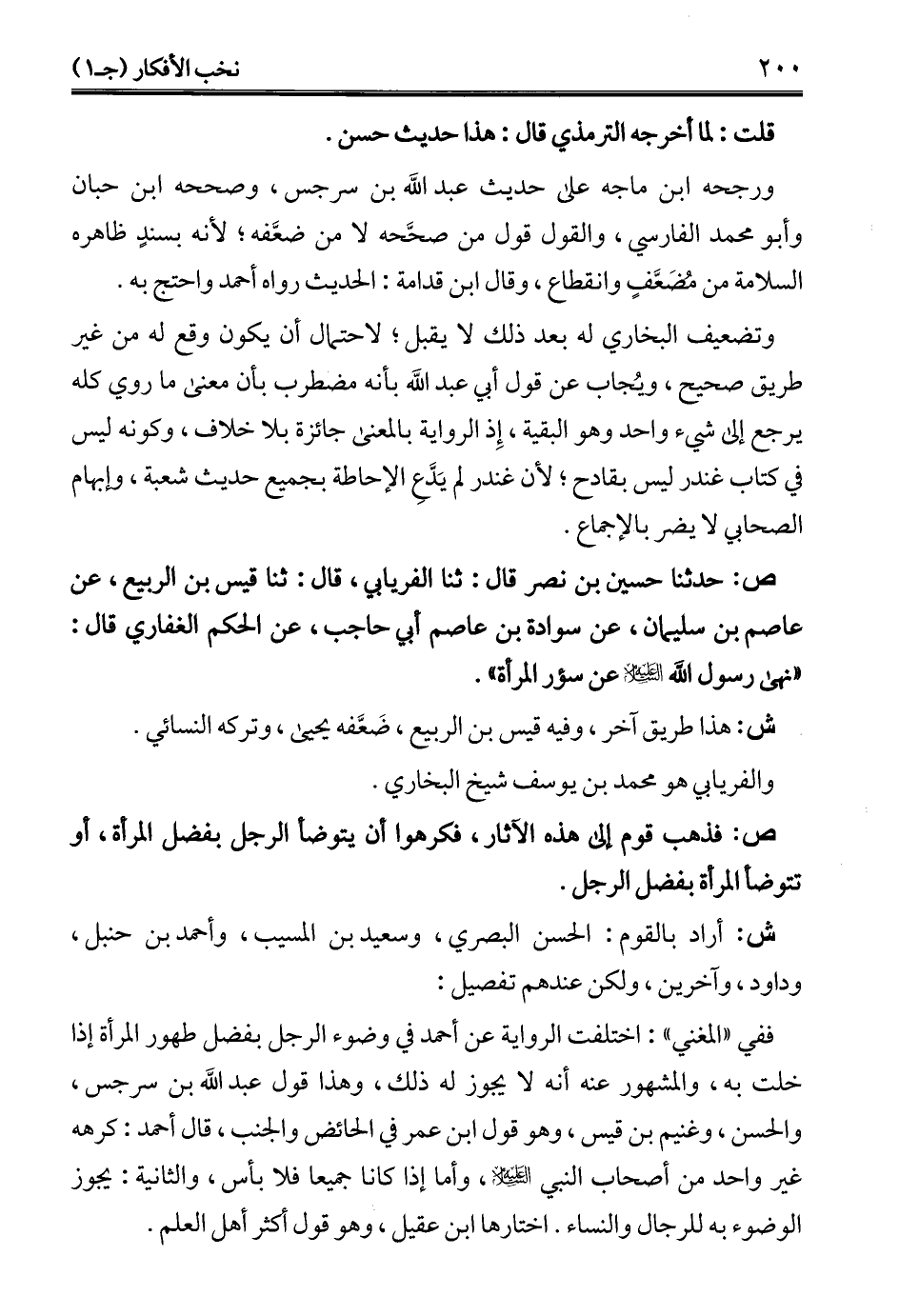 ص: حدثنا حسين بن نصر قال: ثنا الفريايى، قال: ثنا قيس بن الربيع، عن عاصم بن سليمان، عن سوادة بن عاصم أبي حاجب، عن الحكم الغفاري قال: نهي رسول الله - عليه السلام - عن سؤر المرأة".