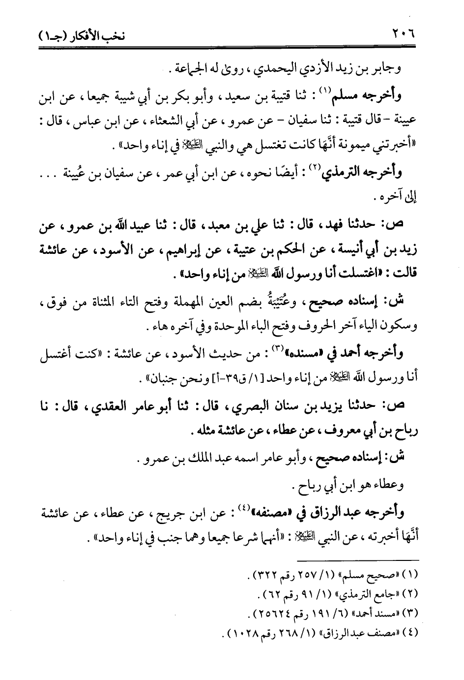 ص: حدثنا فهد، قال: ثنا علي بن معبد، قال: ثنا عبيد الله بن عمرو، عن زيد بن أبي أنيسة، عن الحكم بن عتيية، عن إبراهيم، عن الأسود، عن عائشة قالت: "اغتسلت أنا ورسول الله - عليه السلام - من إناء واحد".