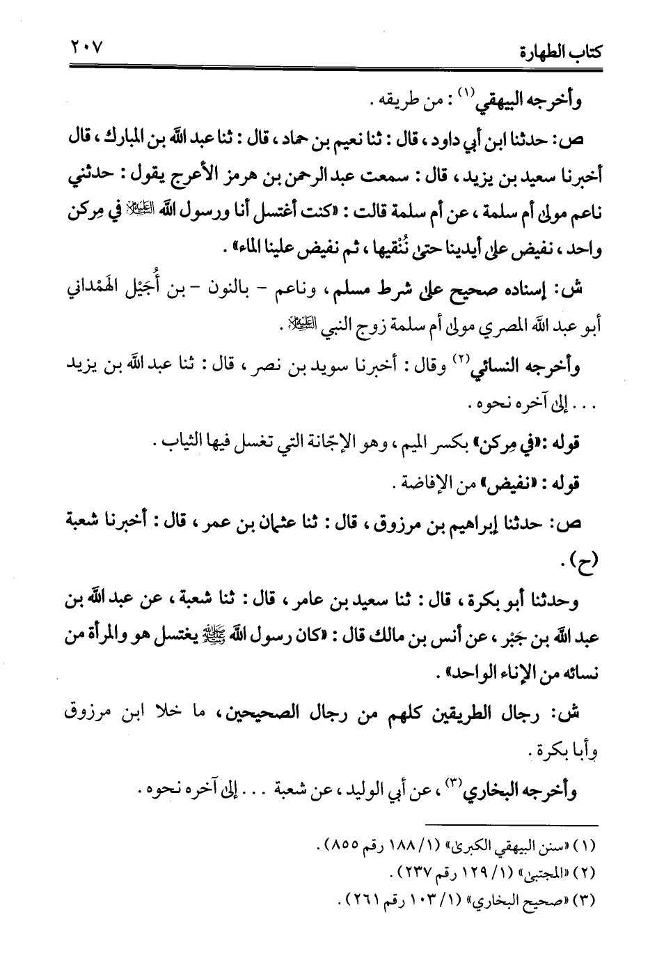 ص: حدثنا ابن أبي داود، قال: ثنا نعيم بن حماد، قال: ثنا عبد الله بن المبارك، قال أخبرنا سعيد بن يزيد، قال: سمعت عبد الرحمن بن هرمز الأعرج يقول: حدثني ناعم مولى أم سلمة، عن أم سلمة قالت: كنت أغتسل أنا ورسول الله - عليه السلام - في مِركن واحد، نفيض على أيدينا حتى نُنْقيها، ثم نفيض علينا الماء".