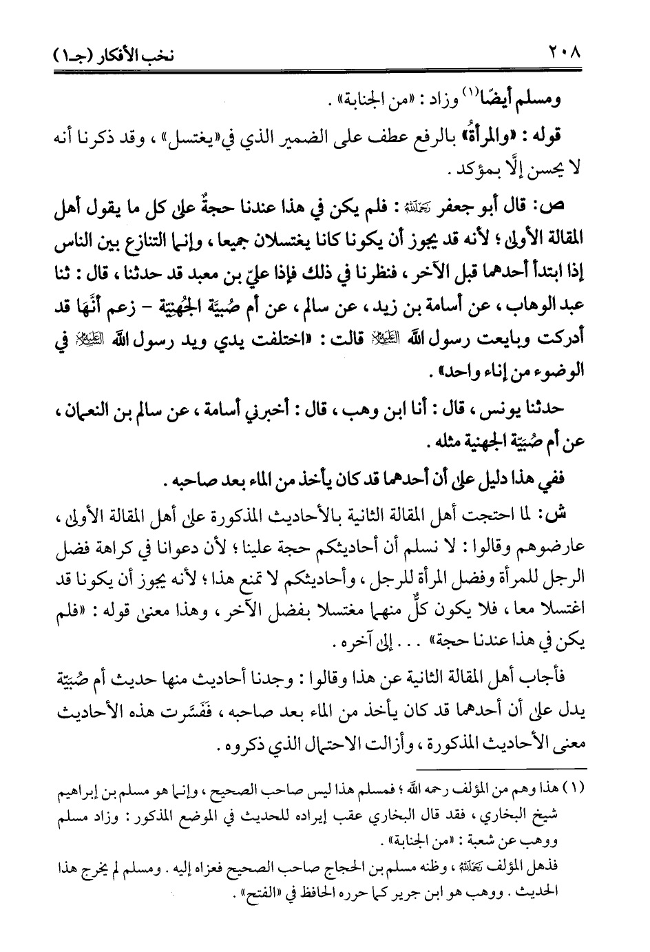 ص: قال أبو جعفر -رحمه الله-: فلم يكن في هذا عندنا حجةٌ على كل ما يقول أهل المقالة الأولى؛ لأنه قد يجوز أن يكونا كانا يغتسلان جميعا، وإنما التنازع بين الناس إذا ابتدأ أحدهما قبل الآخر، فنظرنا في ذلك فإذا عليّ بن معبد قد حدثنا، قال: ثنا عبد الوهاب، عن أسامة بن زيد، عن سالم، عن أم صُبيَّة الجُهنِيّة- زعم أنَّهَا قد أدركت وبايعت رسول الله - عليه السلام - قالت: "اختلفت يدي ويد رسول الله - عليه السلام -في الوضوء من إناء واحد".