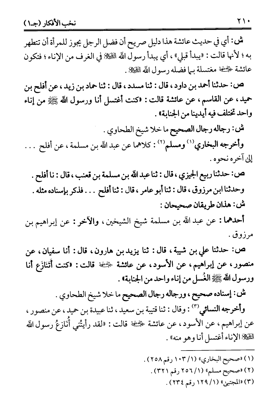 ص: حدثنا علي بن شيبة، قال: ثنا يزيد بن هارون، قال: أنا سفيان، عن منصور، عن إبراهيم، عن الأسود، عن عائشة - رضي الله عنه - قالت: "كنت أَتَنَازعَ أنا ورسول الله - صلى الله عليه وسلم -الغُسل من إناء واحد من الجنابة".