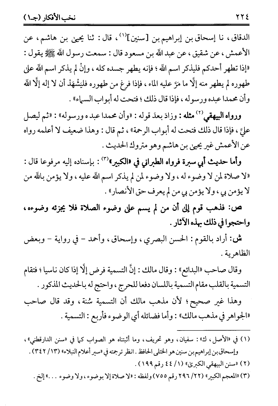 ص: فذهب قوم إلى أن من لم يسم على وضوء الصلاة فلا يجزئه وضوءه، واحتجوا في ذلك بهذه الآثار.