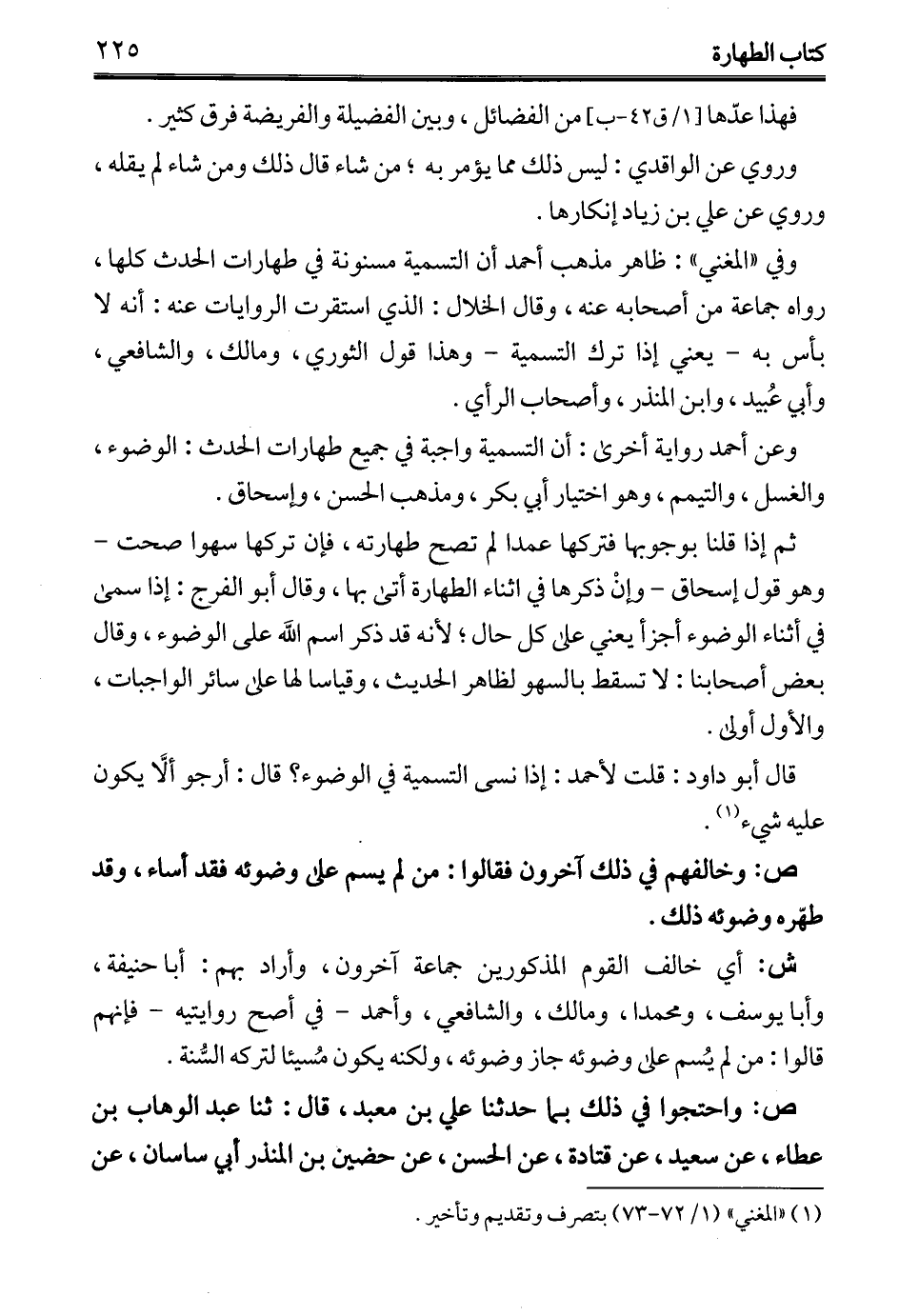 وفي "المغني": ظاهر مذهب أحمد أن التسمية مسنونة في طهارات الحدث كلها، رواه جماعة من أصحابه عنه، وقال الخلال: الذي استقرت الروايات عنه: أنه لا بأس به -يعني إذا ترك التسمية- وهذا قول الثوري، ومالك، والشافعي، وأبي عُبيد، وابن المنذر، وأصحاب الرأي.