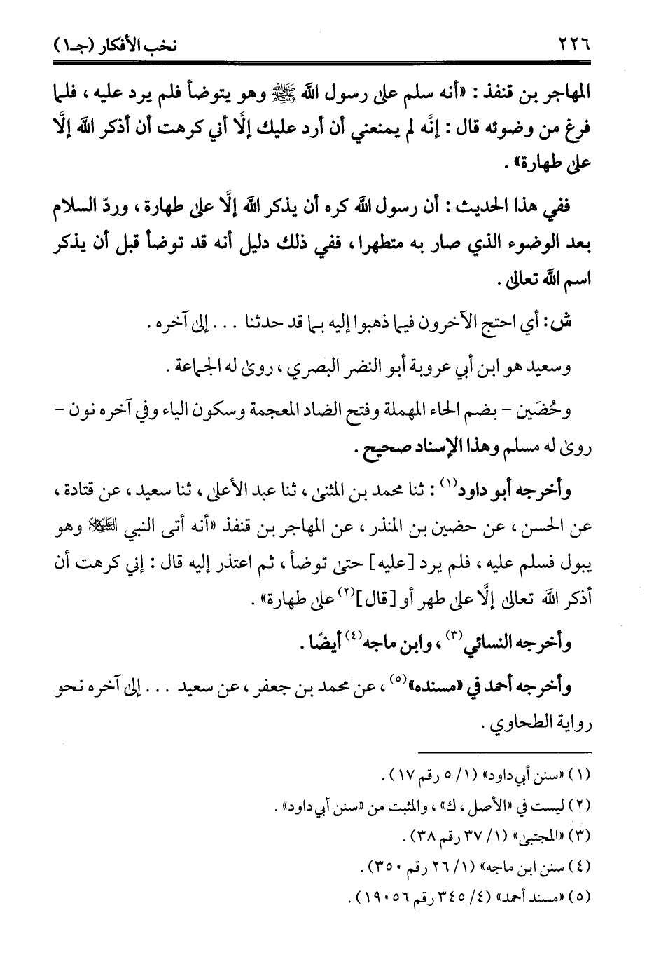 المهاجر بن قنفذ: "أنه سلم على رسول الله - صلى الله عليه وسلم - وهو يتوضأ فلم يرد عليه، فلما فرغ من وضوئه قال: إنَّه لم يمنعني أن أرد عليك إلَّا أني كرهت أن أذكر الله إلَّا على طهارة".