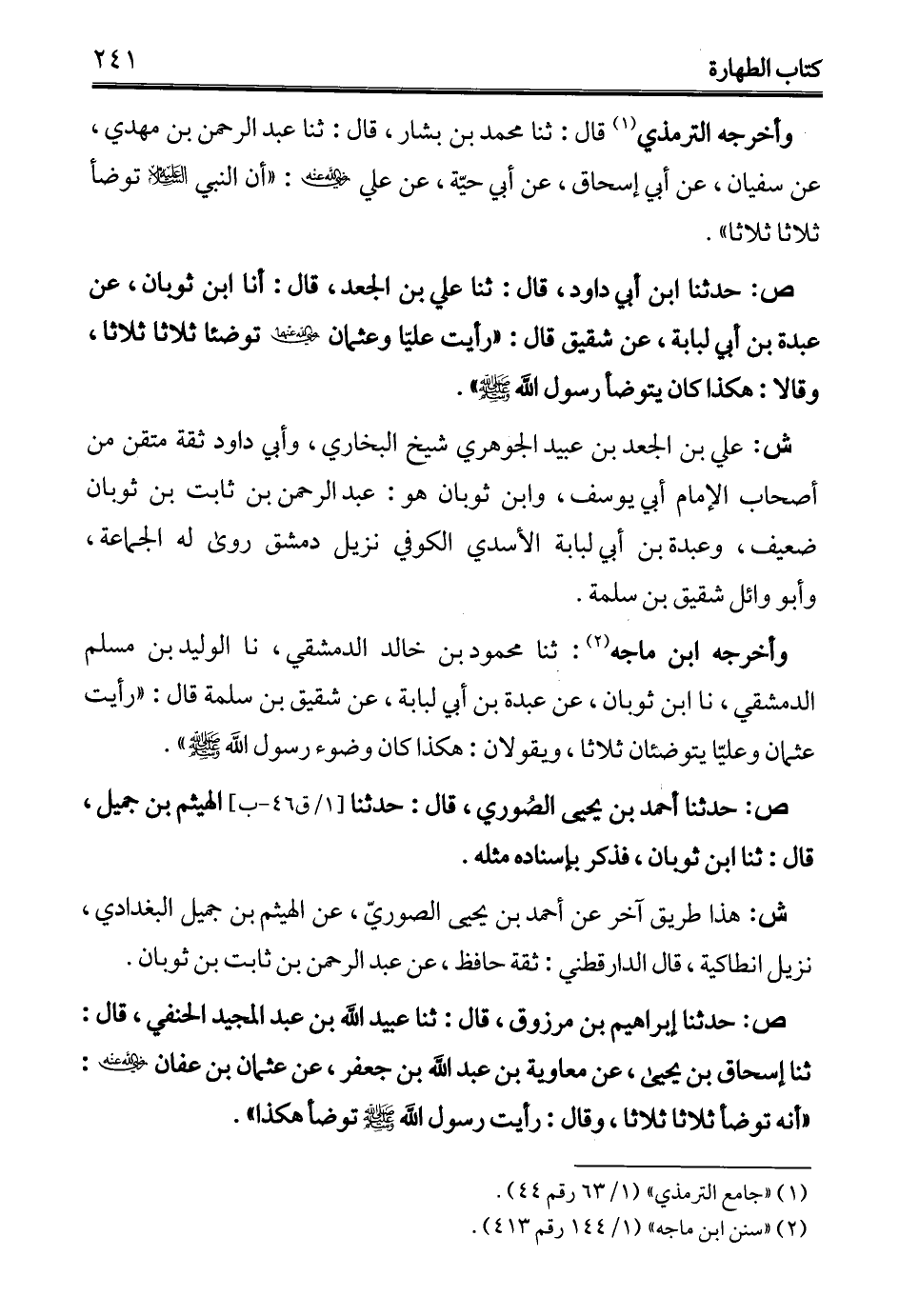 وأخرجه الترمذي (¬1) قال: ثنا محمَّد بن بشار، قال: ثنا عبد الرحمن بن مهدي، عن سفيان، عن أبي إسحاق، عن أبي حيّة، عن علي - رضي الله عنه -: "أن النبي - عليه السلام - توضأ ثلاثا ثلاثا".