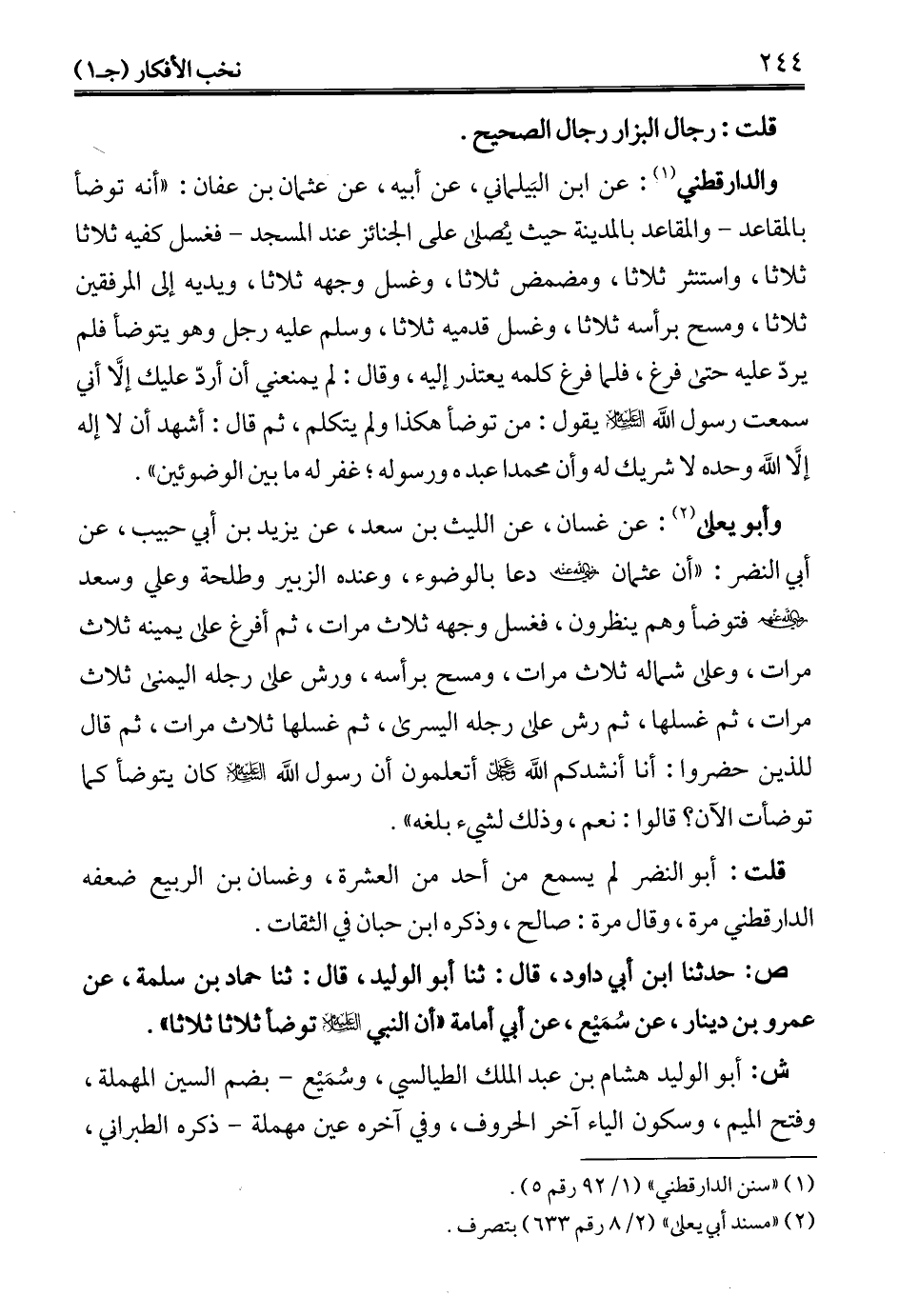وأبو يعلى (¬2): عن غسان، عن الليث بن سعد، عن يزيد بن أبي حبيب، عن أبي النضر: "أن عثمان - رضي الله عنه - دعا بالوضوء، وعنده الزبير وطلحة وعلي وسعد - رضي الله عنه - فتوضأ وهم ينظرون، فغسل وجهه ثلاث مرات، ثم أفرغ على يمينه ثلاث مرات، وعلي شماله ثلاث مرات، ومسح برأسه، ورش على رجله اليمنى ثلاث مرات، ثم غسلها، ثم رش على رجله اليسرى، ثم غسلها ثلاث مرات، ثم قال للذين حضروا: أنا أنشدكم الله عز وجل أتعلمون أن رسول الله - عليه السلام - كان يتوضأ كما توضأت الآن؟ قالوا: نعم، وذلك لشيء بلغه".