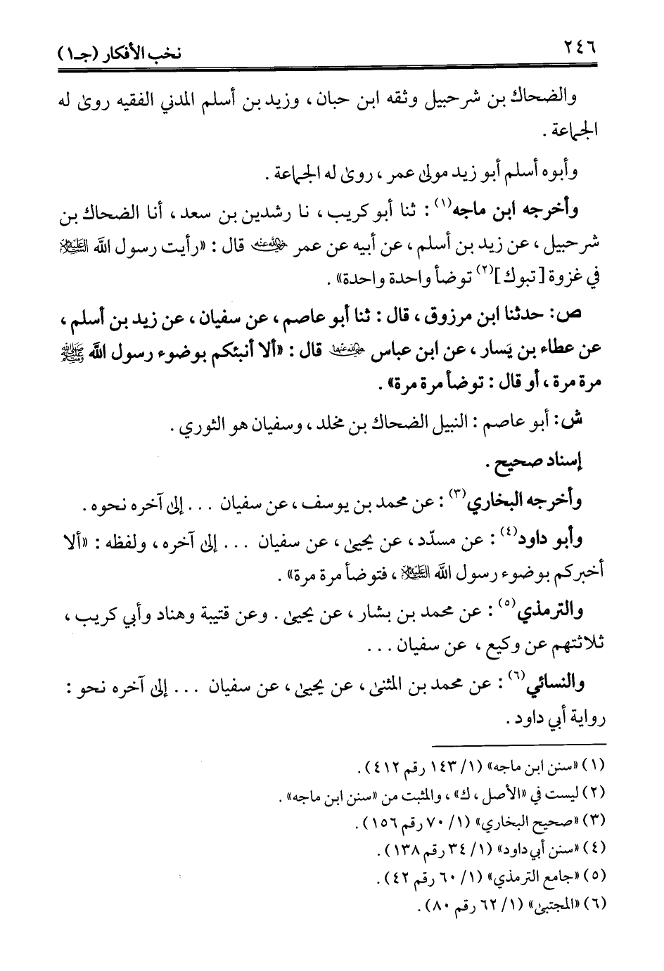 ص: حدثنا ابن مرزوق، قال: ثنا أبو عاصم، عن سفيان، عن زيد بن أسلم، عن عطاء بن يَسار، عن ابن عباس - رضي الله عنهما - قال: "ألا أنبئكم بوضوء رسول الله - صلى الله عليه وسلم - مرة مرة، أو قال: توضأ مرة مرة".