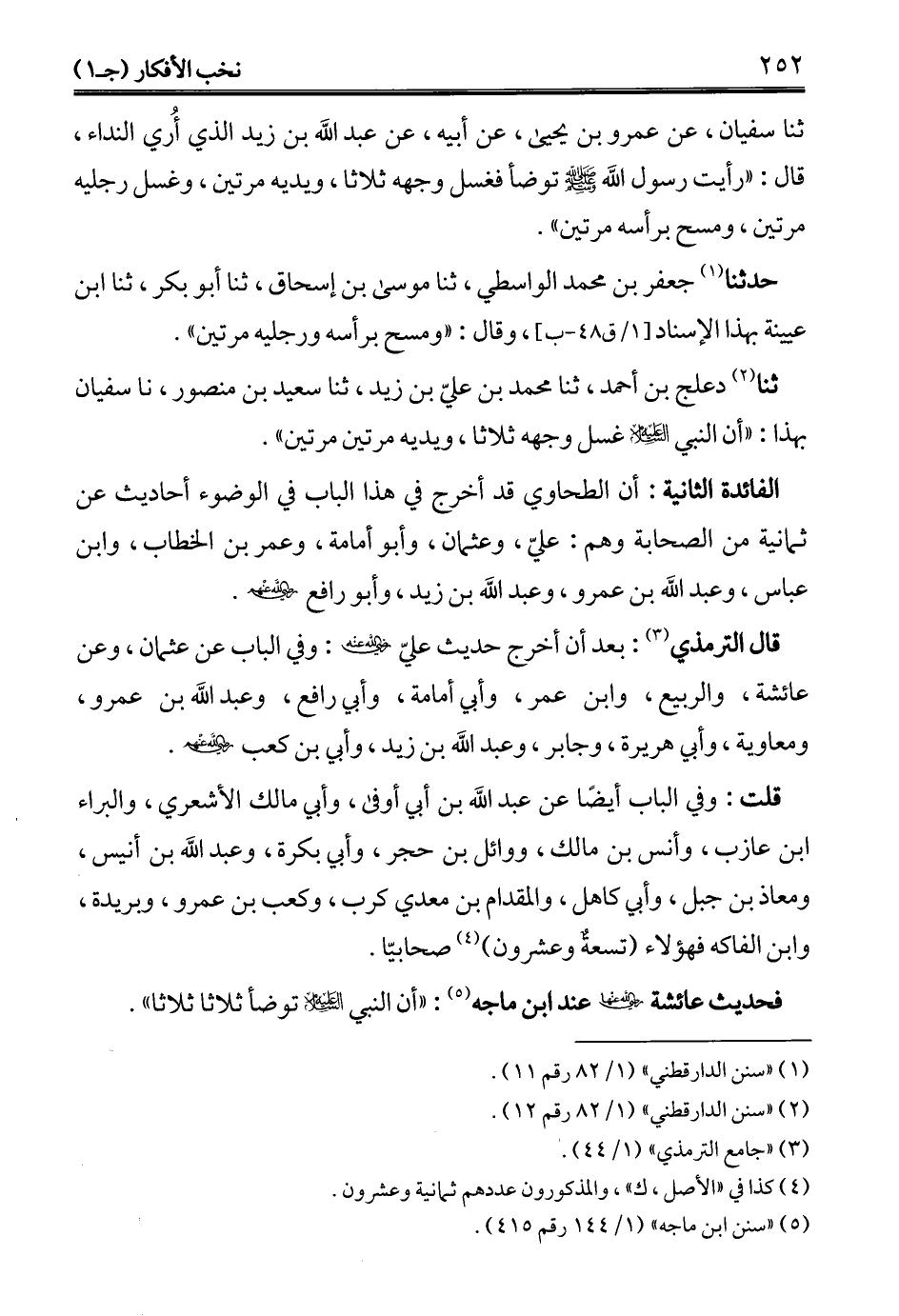 الفائدة الثانية: أن الطحاوي قد أخرج في هذا الباب في الوضوء أحاديث عن ثمانية من الصحابة وهم: عليّ، وعثمان، وأبو أمامة، وعمر بن الخطاب، وابن عباس، وعبد الله بن عمرو، وعبد الله بن زيد، وأبو رافع - رضي الله عنهم -.