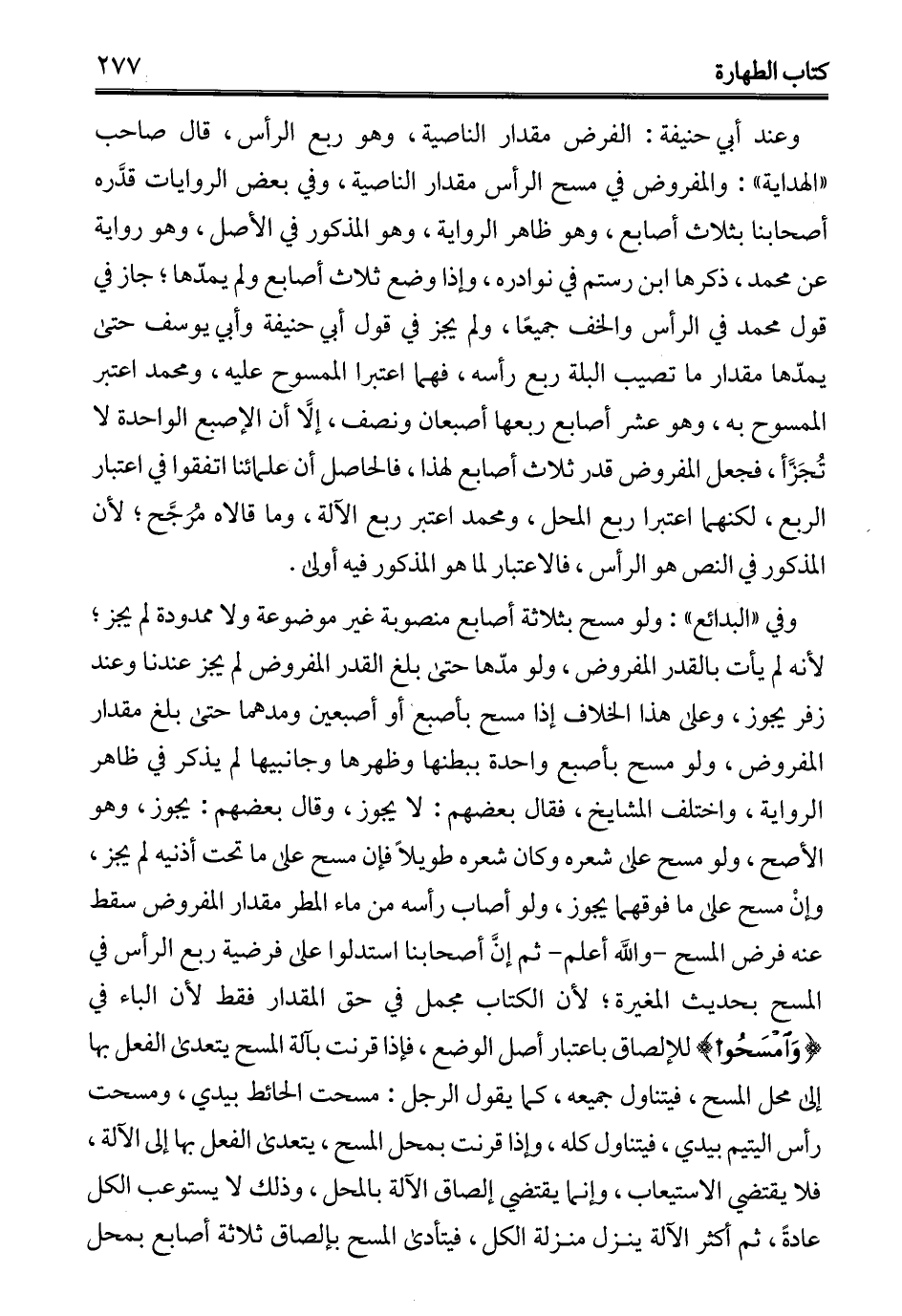 وعند أبي حنيفة: الفرض مقدار الناصية، وهو ربع الرأس، قال صاحب "الهداية": والمفروض في مسح الرأس مقدار الناصية، وفي بعض الروايات قدَّره أصحابنا بثلاث أصابع، وهو ظاهر الرواية، وهو المذكور في الأصل، وهو رواية عن محمَّد، ذكرها ابن رستم في نوادره، وإذا وضع ثلاث أصابع ولم يمدّها؛ جاز في قول محمَّد في الرأس والخف جميعًا، ولم يجز في قول أبي حنيفة وأبي يوسف حتى يمدّها مقدار ما تصيب البلة ربع رأسه، فهما اعتبرا الممسوح عليه، ومحمد اعتبر الممسوح به، وهو عشر أصابع ربعها أصبعان ونصف، إلَّا أن الإصبع الواحدة لا تُجَزَّأ، فجعل المفروض قدر ثلاث أصابع لهذا، فالحاصل أن علمائنا اتفقوا في اعتبار الربع، لكنهما اعتبرا ربع المحل، ومحمد اعتبر ربع الآلة، وما قالاه مُرَجَّح؛ لأن المذكور في النص هو الرأس، فالاعتبار لما هو المذكور فيه أولى.