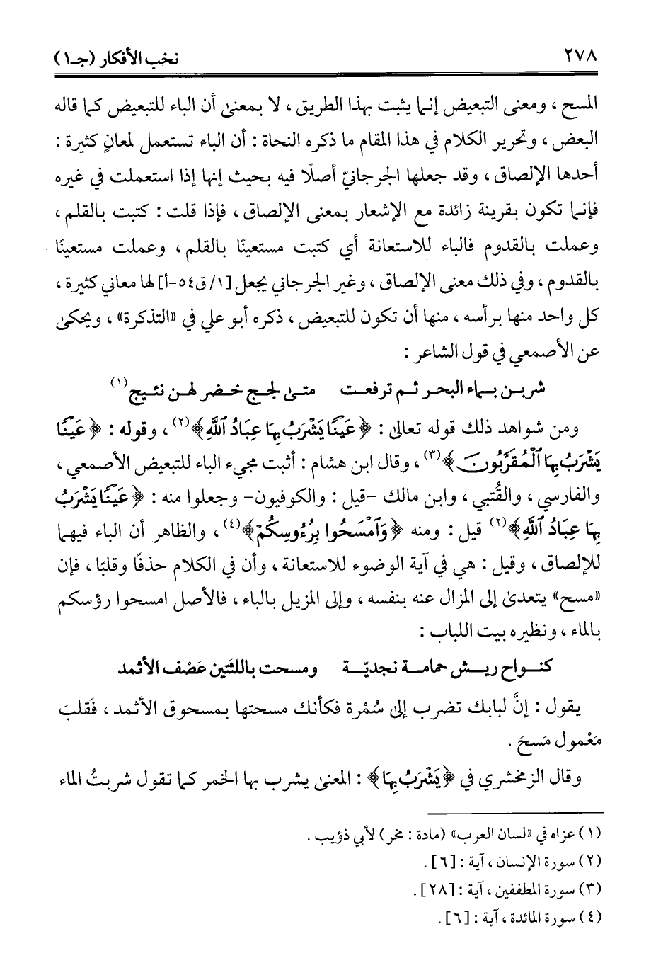 ومن شواهد ذلك قوله تعالى: {عَيْنًا يَشْرَبُ بِهَا عِبَادُ اللَّهِ} (¬2)، وقوله: {عَيْنًا يَشْرَبُ بِهَا الْمُقَرَّبُونَ} (¬3)، وقال ابن هشام: أثبت مجيء الباء للتبعيض الأصمعي، والفارسي، والقُتبي، وابن مالك -قيل: والكوفيون- وجعلوا منه: {عَيْنًا يَشْرَبُ بِهَا عِبَادُ اللَّهِ} (2) قيل: {وَامْسَحُوا بِرُءُوسِكُمْ} (¬4)، والظاهر أن الباء فيهما للإلصاق، وقيل: هي في آية الوضوء للاستعانة، وأن في الكلام حذفًا وقلبًا، فإن "مسح" يتعدى إلى المزال عنه بنفسه، وإلى المزيل بالباء، فالأصل امسحوا رؤسكم بالماء، ونظيره بيت اللباب: