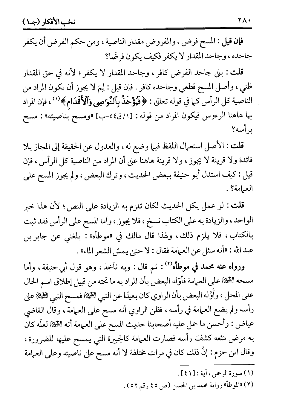 قلت: بلى جاحد الفرض كافر، وجاحد المقدار لا يكفر؛ لأنه في حق المقدار ظني، وأصل المسح قطعي وجاحده كافر. فإن قيل: لِمَ لا يجوز أن يكون المراد من الناصية كل الرأس كما في قوله تعالى: {فَيُؤْخَذُ بِالنَّوَاصِي وَالْأَقْدَامِ} (¬1)، فإن المراد بها ها هنا الرءوس فيكون المراد من قوله: "ومسح بناصيته": مسح برأسه؟