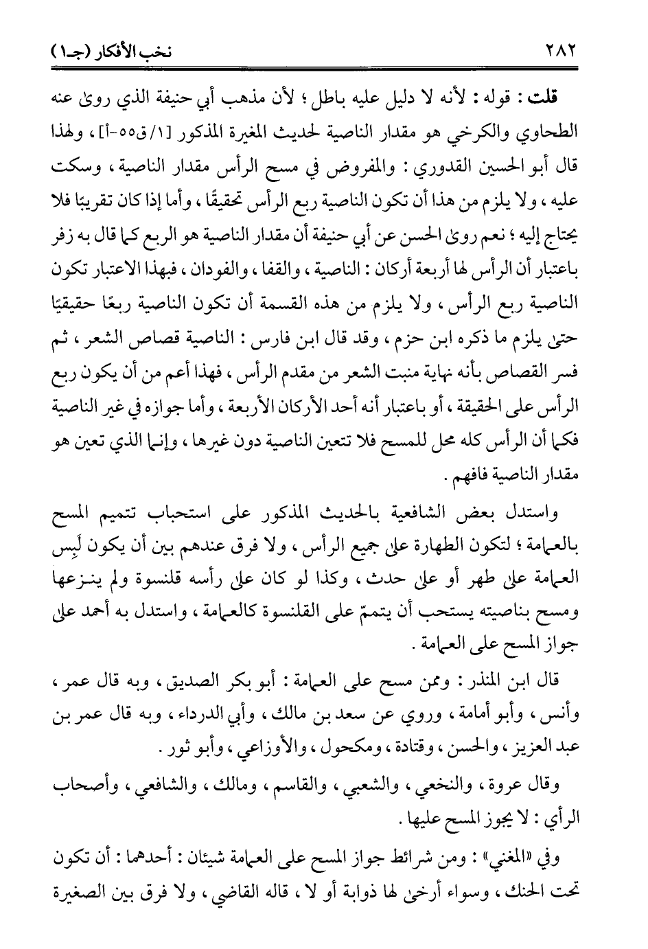 قلت: قوله: لأنه لا دليل عليه باطل؛ لأن مذهب أبي حنيفة الذي روى عنه الطحاوي والكرخي هو مقدار الناصية لحديث المغيرة المذكور، ولهذا قال أبو الحسين القدوري: والمفروض في مسح الرأس مقدار الناصية، وسكت عليه، ولا يلزم من هذا أن تكون الناصية ربع الرأس تحقيقًا، وأما إذا كان تقريبًا فلا يحتاج إليه؛ نعم روى الحسن عن أبي حنيفة أن مقدار الناصية هو الربع كما قال به زفر باعتبار أن الرأس لها أربعة أركان: الناصية، والقفا، والفودان، فبهذا الاعتبار تكون الناصية ربع الرأس، ولا يلزم من هذه القسمة أن تكون الناصية ربعًا حقيقيًا حتى يلزم ما ذكره ابن حزم، وقد قال ابن فارس: الناصية قصاص الشعر، ثم فسر القصاص بأنه نهاية منبت الشعر من مقدم الرأس، فهذا أعم من أن يكون ربع الرأس على الحقيقة، أو باعتبار أنه أحد الأركان الأربعة، وأما جوازه في غير الناصية فكما أن الرأس كله محل للمسح فلا تتعين الناصية دون غيرها، وإنما الذي تعين هو مقدار الناصية فافهم.