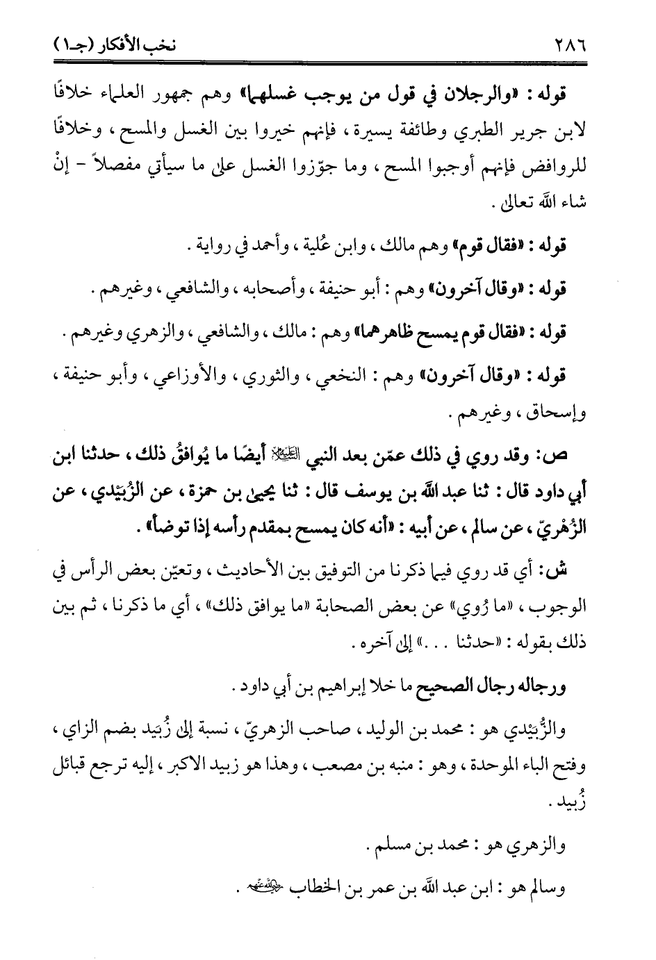 ص: وقد روي في ذلك عمّن بعد النبي - عليه السلام - أيضًا ما يُوافقُ ذلك، حدثنا ابن أبي داود قال: ثنا عبد الله بن يوسف قال: ثنا يحيى بن حمزة، عن الزُبَيْدي، عن الزُهْريّ، عن سالم، عن أبيه: "أنه كان يمسح بمقدم رأسه إذا توضأ".
