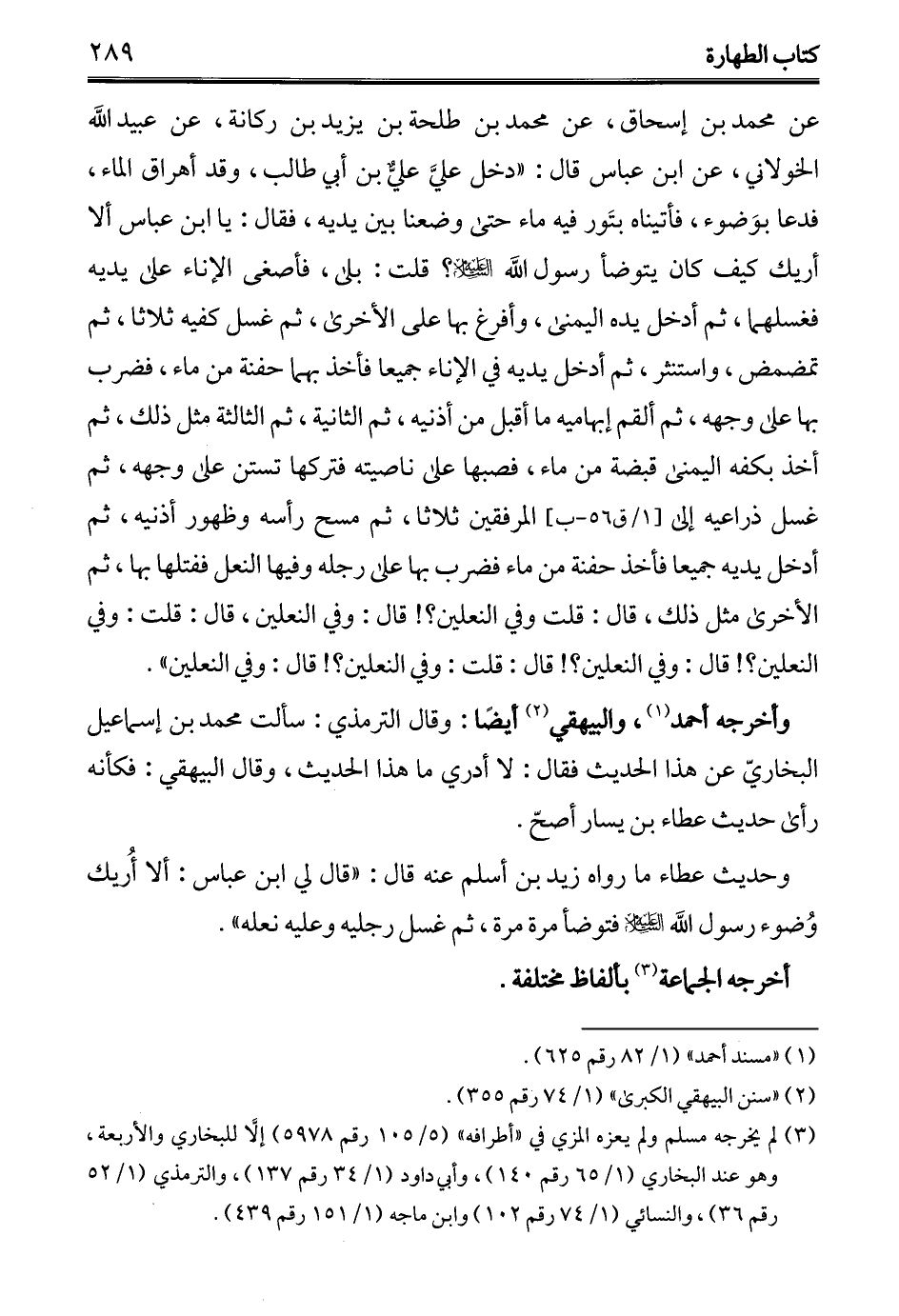 عن محمد بن إسحاق، عن محمد بن طلحة بن يزيد بن ركانة، عن عبيد الله الخولاني، عن ابن عباس قال: "دخل عليَّ عليٌّ بن أبي طالب، وقد أهراق الماء، فدعا بوَضوء، فأتيناه بتَور فيه ماء حتى وضعنا بين يديه، فقال: يا ابن عباس ألا أريك كيف كان يتوضأ رسول الله - عليه السلام -؟ قلت: بلى، فأصغى الإناء على يديه فغسلهما، ثم أدخل يده اليمني، وأفرغ بها على الأخرى، ثم غسل كفيه ثلاثا، ثم تمضمض، واستنثر، ثم أدخل يديه في الإناء جميعا فأخذ بهما حفنة من ماء، فضرب بها على وجهه، ثم ألقم إبهاميه ما أقبل من أذنيه، ثم الثانية، ثم الثالثة مثل ذلك، ثم أخذ بكفه اليمنى قبضة من ماء، فصبها على ناصيته فتركها تستن على وجهه، ثم غسل ذراعيه إلى المرفقين ثلاثا، ثم مسح رأسه وظهور أذنيه، ثم أدخل يديه جميعا فأخذ حفنة من ماء فضرب بها على رجله وفيها النعل ففتلها بها، ثم الأخرى مثل ذلك، قال: قلت وفي النعلين؟! قال: وفي النعلين، قال: قلت: وفي النعلين؟! قال: وفي النعلين؟! قال: قلت: وفي النعلين؟! قال: وفي النعلين".