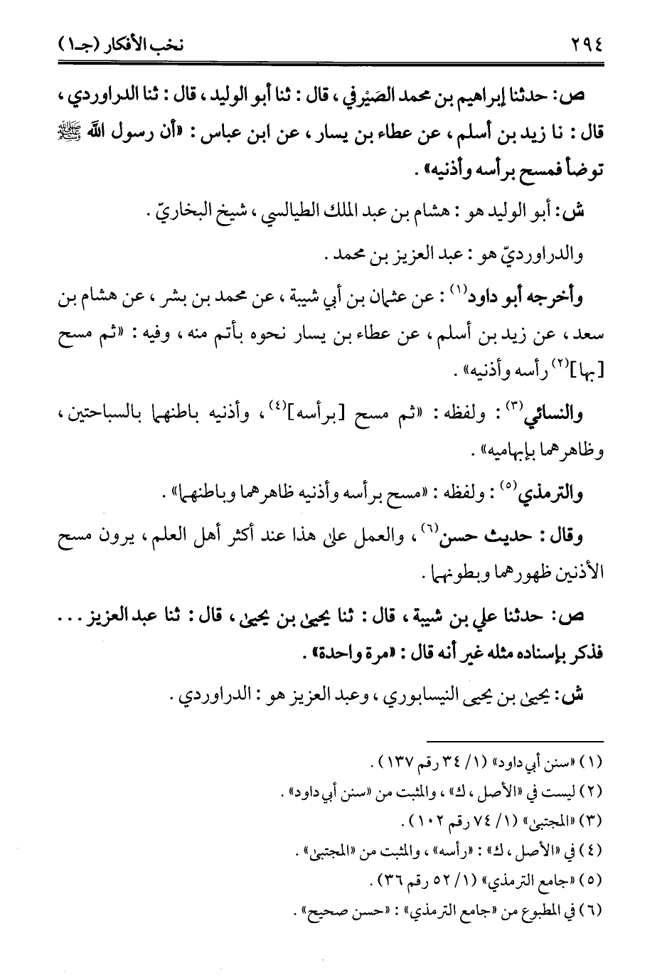 ص: حدثنا إبراهيم بن محمَّد الصَيْرفي، قال: ثنا أبو الوليد، قال: ثنا الدراوردي، قال: نا زيد بن أسلم، عن عطاء بن يسار، عن ابن عباس: أن رسول - صلى الله عليه وسلم - توضأ فمسح برأسه وأذنيه".