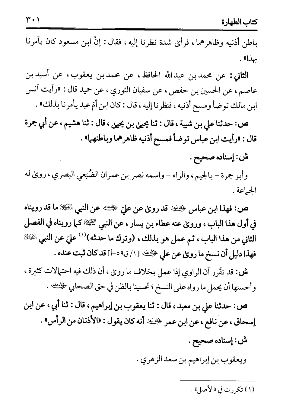ص: حدثنا علي بن معبد، قال: ثنا يعقوب بن إبراهيم، قال: ثنا أبي، عن ابن إسحاق، عن نافع، عن ابن عمر - رضي الله عنه - أنه كان يقول: "الأذنان من الرأس".