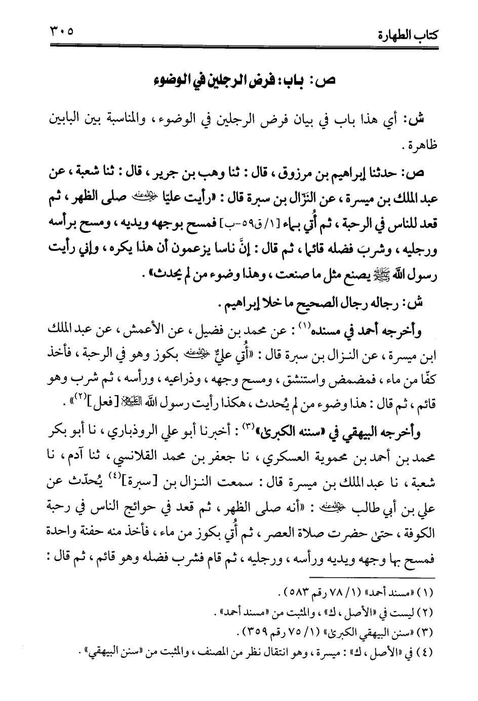 ص: حدثنا إبراهيم بن مرزوق، قال: ثنا وهب بن جرير، قال: ثنا شعبة، عن عبد الملك بن ميسرة، عن النَزّال بن سبرة قال: "رأيت عليّا - رضي الله عنه - صلى الظهر، ثم قعد للناس في الرحبة، ثم أُتي بماء فمسح بوجهه ويديه، ومسح برأسه ورجليه، وشربَ فضله قائمًا، ثم قال: إنَّ ناسا يزعمون أن هذا يكره، وإني رأيت رسول الله - صلى الله عليه وسلم - يصنع مثل ما صنعت، وهذا وضوء من لم يحدث".