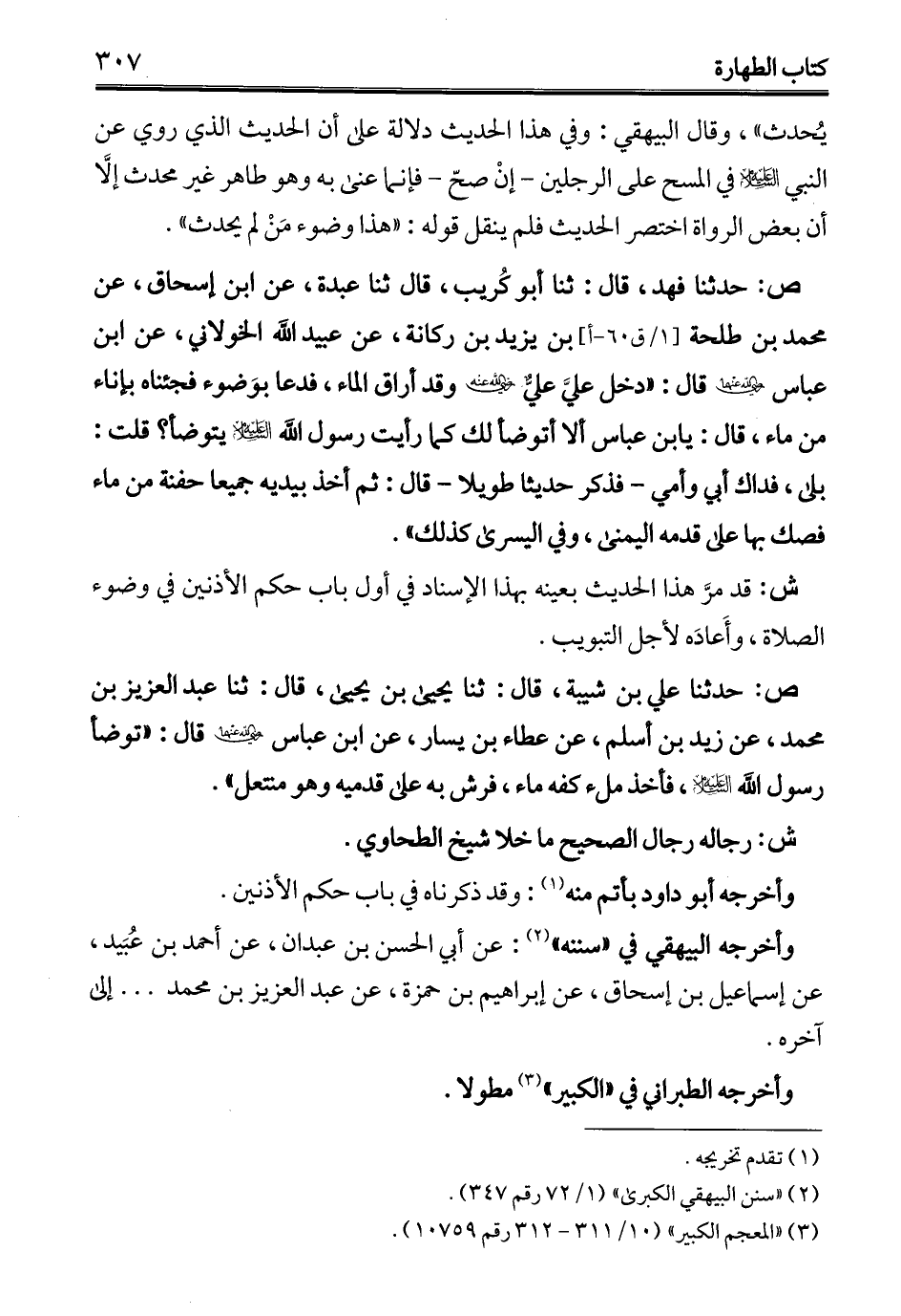 ص: حدثنا علي بن شيبة، قال: ثنا يحيى بن يحيى، قال: ثنا عبد العزيز بن محمَّد، عن زيد بن أسلم، عن عطاء بن يسار، عن ابن عباس - رضي الله عنهما - قال: "توضأ رسول الله - عليه السلام -، فأخذ ملء كله ماء، فرش به على قدميه وهو منتعل".