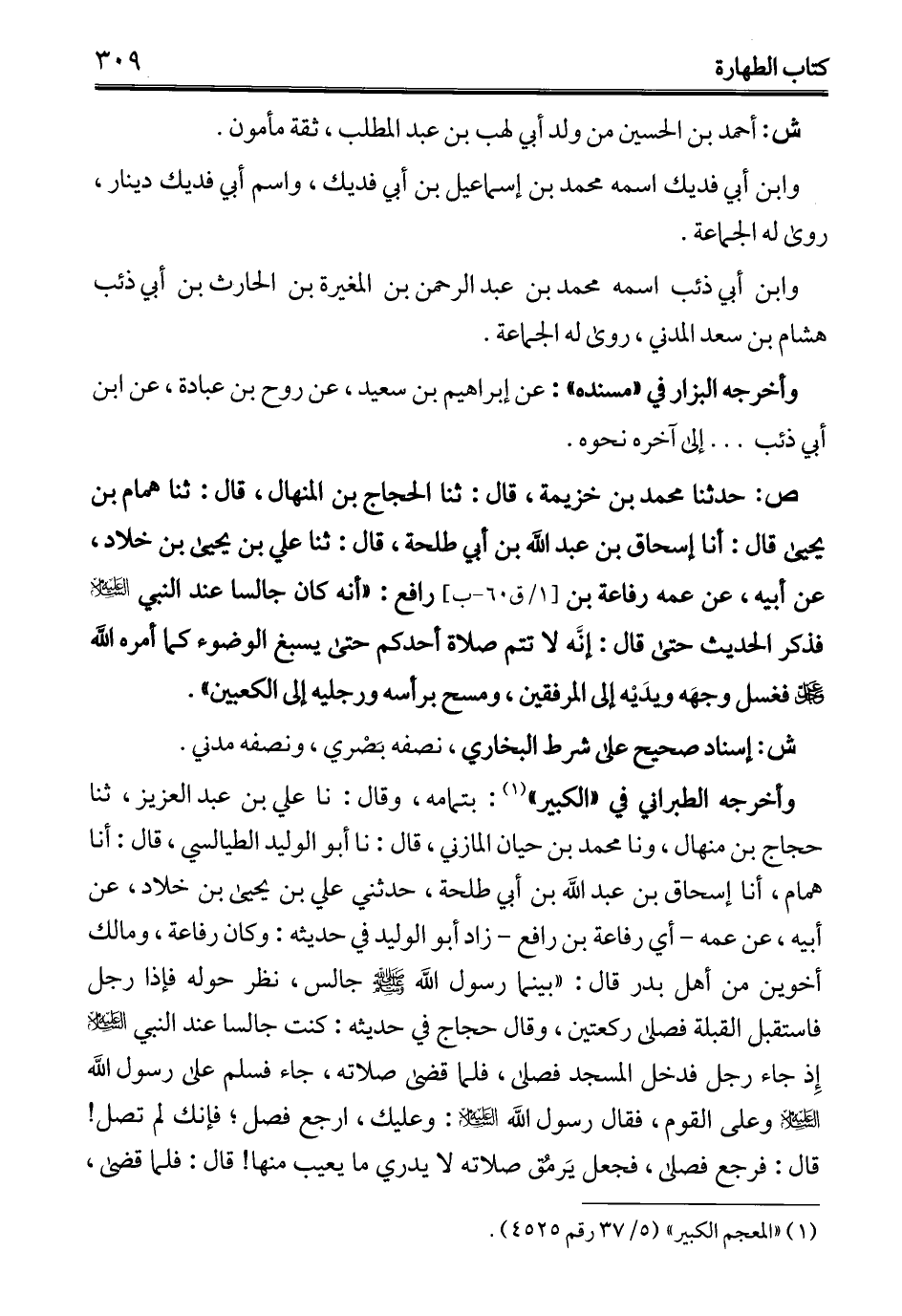 ص: حدثنا محمَّد بن خزيمة، قال: ثنا الحجاج بن المنهال، قال: ثنا همام بن يحيى قال: أنا إسحاق بن عبد الله بن أبي طلحة، قال: ثنا علي بن يحيى بن خلاد، عن أبيه، عن عمه رفاعة بن رافع: "أنه كان جالسا عند النبي - عليه السلام - فذكر الحديث حتى قال: إنَّه لا تتم صلاة أحدكم حتى يسبغ الوضوء كما أمره الله عز وجل فغسل وجهَه ويدَيْه إلى المرفقين، ومسح برأسه ورجليه إلى الكعبين".
