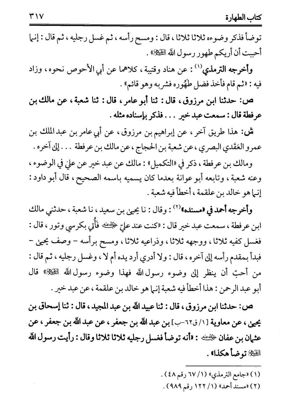 وأخرجه أحمد في "مسنده" (¬2): وقال: نا يحيى بن سعيد، نا شعبة، حدثني مالك ابن عرفطة، سمعت عبد خير قال: "كنت عند عليّ - رضي الله عنه - فَأُتي بكرسي وتور، قال: فغسل كفيه ثلاثا، ووجهه ثلاثا، وذراعيه ثلاثا، ومسح برأسه -وصف يحيى- فبدأ بمقدم رأسه إلى آخره، قال: ولا أدري أرد يده أم لا، وغسل رجليه، ثم قال: من أحبّ أن ينظر إلى وضوء رسول الله فهذا وضوء رسول الله -عليه السلام -" قال أبو عبد الرحمن: هذا أخطأ فيه شعبة إنما هو خالد بن علقمة، عن عبد خير.
