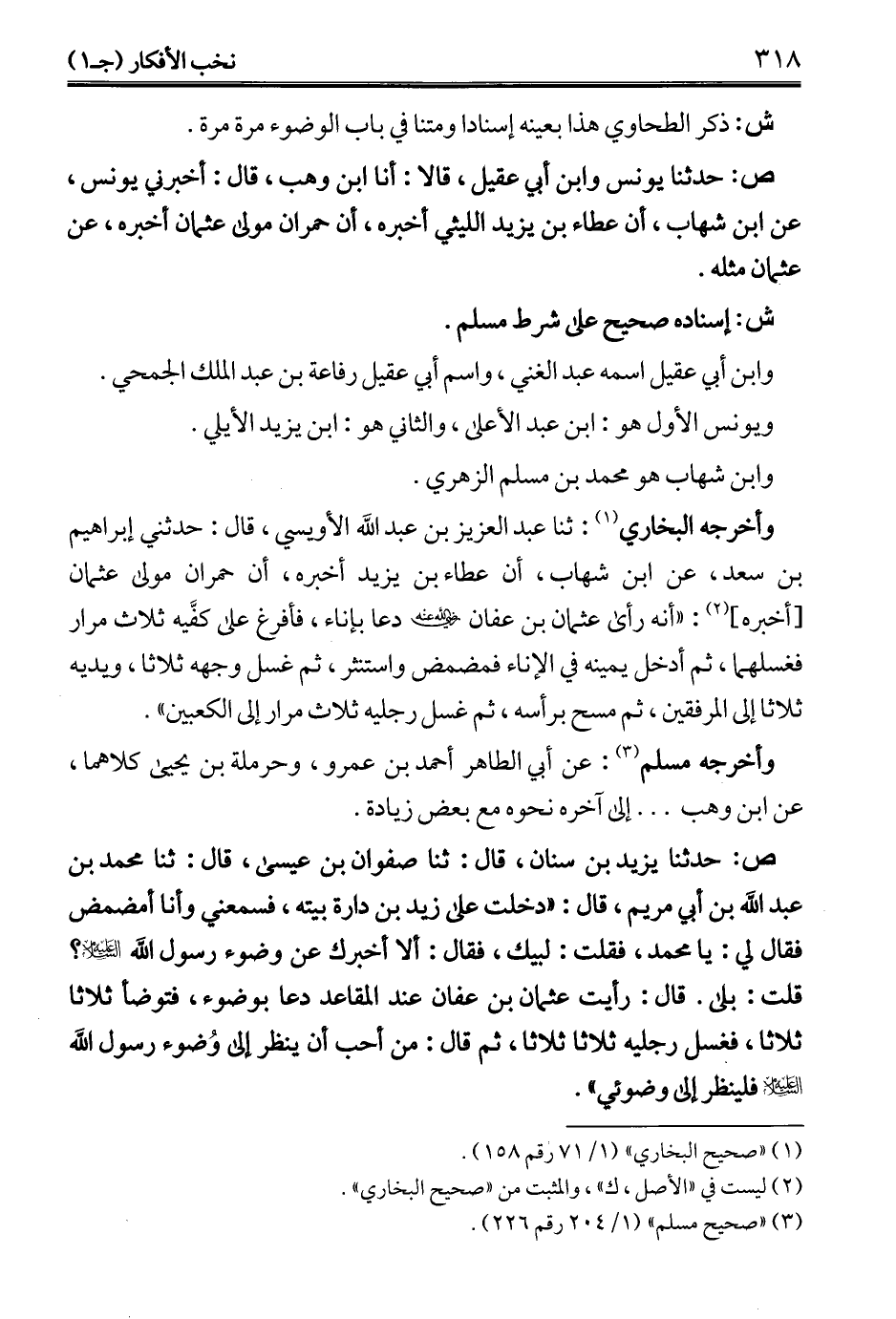 وأخرجه البخاري (¬1): ثنا عبد العزيز بن عبد الله الأويسي، قال: حدثني إبراهيم بن سعد، عن ابن شهاب، أن عطاء بن يزيد أخبره، أن حمران مولى عثمان [أخبره]، (¬2): "أنه رأى عثمان بن عفان - رضي الله عنه - دعا بإناء، فأفرغ على كفَّيه ثلاث مرار فغسلهما، ثم أدخل يمينه في الإناء فمضمض واستنثر، ثم غسل وجهه ثلاثا، ويديه ثلاثا إلى المرفقين، ثم مسح برأسه، ثم غسل رجليه ثلاث مرار إلى الكعبين".