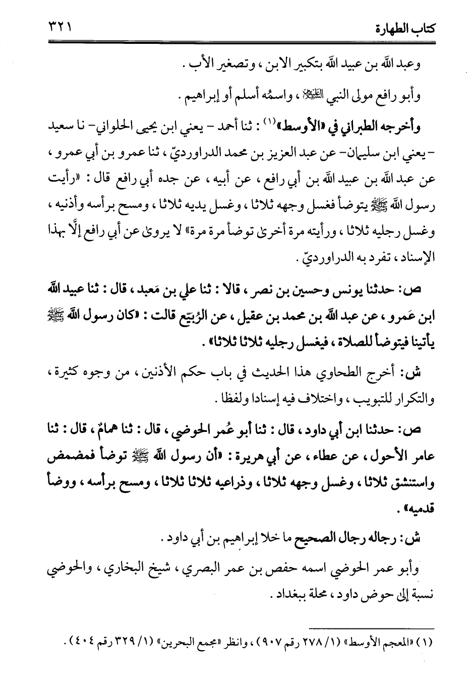 وأخرجه الطبراني في "الأوسط" (¬1): ثنا أحمد -يعني ابن يحيى الحلواني- نا سعيد -يعني ابن سليمان- عن عبد العزيز بن محمَّد الدراورديّ، ثنا عمرو بن أبي عمرو، عن عبد الله بن عبيد الله بن أبي رافع، عن أبيه، عن جده أبي رافع قال: "رأيت رسول الله - صلى الله عليه وسلم - يتوضأ فغسل وجهه ثلاثا، وغسل يديه ثلاثا، ومسح برأسه وأذنيه، وغسل رجليه ثلاثا، ورأيته مرة أخرى توضأ مرة مرة" لا يروى عن أبي رافع إلَّا بهذا الإسناد، تفرد به الدراورديّ.