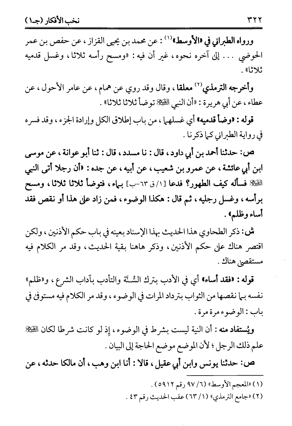 ورواه الطبراني في "الأوسط" (¬1): عن محمَّد بن يحيى القزاز، عن حفص بن عمر الحوضي ... إلى آخره نحوه، غير أن فيه: "ومسح رأسه ثلاثا، وغسل قدميه ثلاثا".