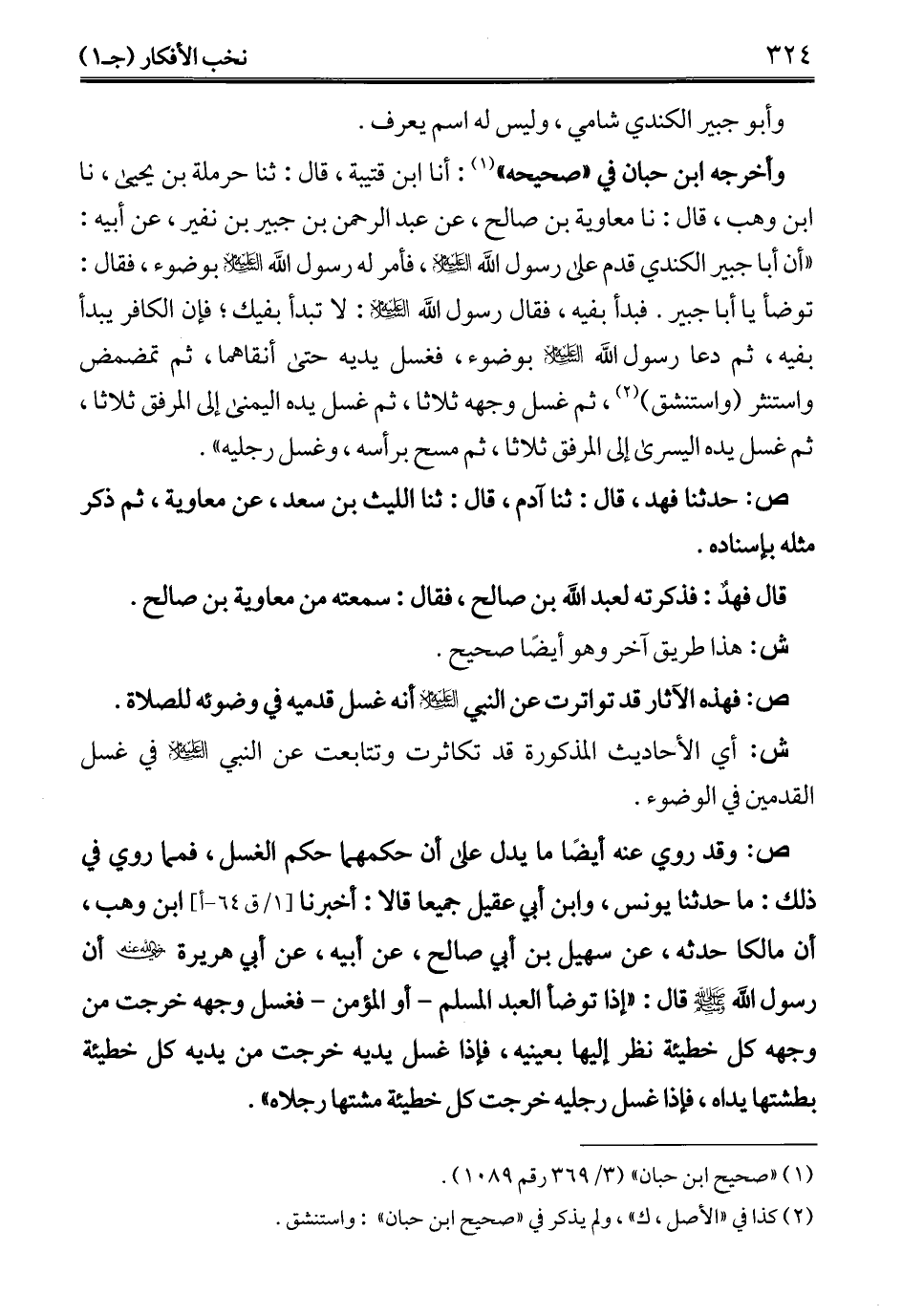 وأخرجه ابن حبان في "صحيحه" (¬1): أنا ابن قتيبة، قال: ثنا حرملة بن يحيى، نا ابن وهب، قال: نا معاوية بن صالح، عن عبد الرحمن بن جبير بن نفير، عن أبيه: "أن أبا جبير الكندي قدم على رسول الله - عليه السلام -، فأمر له رسول الله - عليه السلام - بوضوء، فقال: توضأ يا أبا جبير. فبدأ بفيه، فقال رسول الله - عليه السلام -: لا تبدأ بفيك؛ فإن الكافر يبدأ بفيه، ثم دعا رسول الله - عليه السلام - بوضوء، فغسل يديه حتى أنقاهما، ثم تمضمض واستنثر (واستنشق) (¬2)، ثم غسل وجهه ثلاثا، ثم غسل يده اليمنى إلى المرفق ثلاثا، ثم غسل يده اليسرى إلى المرفق ثلاثا، ثم مسح برأسه، وغسل رجليه".