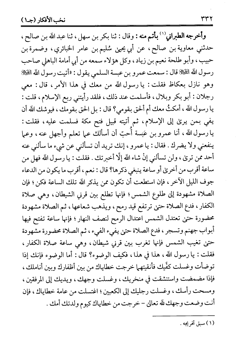 أبواب جهنم وتسجر، فدع الصلاة حتى يفيء الفيء، ثم الصلاة محضورة مشهودة حتى تغيب الشمس فإنها تغرب بين قرني شيطان، وهي ساعة صلاة الكفار، فقلت: يا رسول الله، هذا في هذا، فكيف الوضوء؟ قال: أما الوضوء فإنك إذا توضأت وغسلت كفَّيك فأنقيتهما خرجت خطاياك من بين أظفارك وبين أناملك، فإذا مضمضت واستنشقت في منخريك، وغسلت وجهك، ويديك إلى المرفقين، ومسحت رأسك، وغسلت رجليك إلى الكعبين؛ اغتسلت من عامة خطاياك، فإن أنت وضعت وجهك لله تعالى- خرجت من خطاياك كيوم ولدتك أمك.