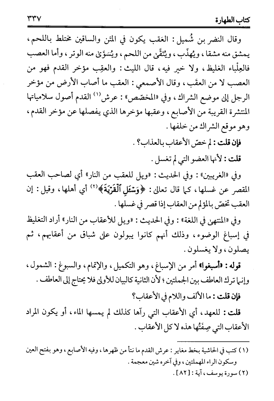 وفي "الغريبين": وفي الحديث: "ويل للعقب من النار" أي لصاحب العقب المقصر عن غسلها، كما قال تعالى: {وَاسْأَلِ الْقَرْيَةَ} (¬2) أي أهلها، وقيل: إن العقب تخصّ بالمؤلم من العقاب إذا قصر في غسلها.