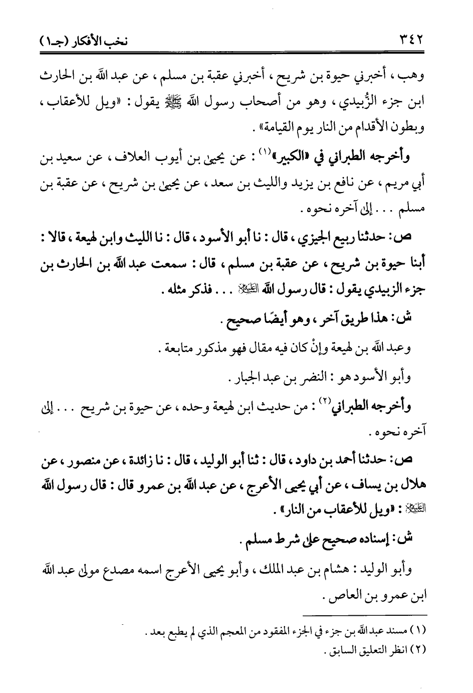 وهب، أخبرني حيوة بن شريح، أخبرني عقبة بن مسلم، عن عبد الله بن الحارث ابن جزء الزُّبيدي، وهو من أصحاب رسول الله - صلى الله عليه وسلم - يقول: "ويل للأعقاب، وبطون الأقدام من النار يوم القيامة".