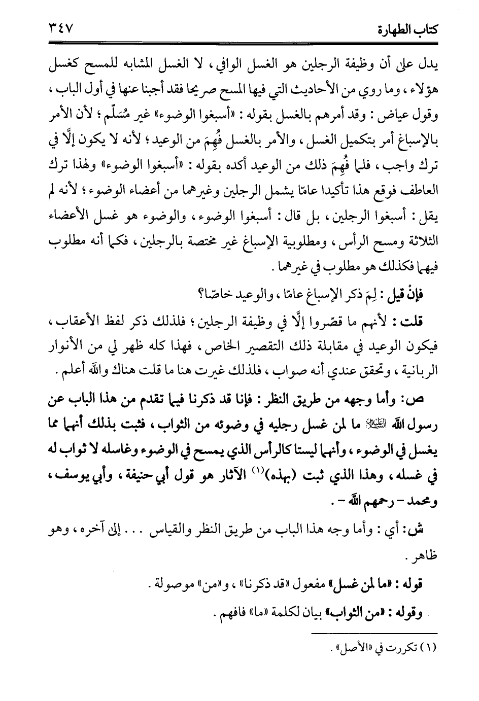 قلت: لأنهم ما قصّروا إلَّا في وظيفة الرجلين؛ فلذلك ذكر لفظ الأعقاب، فيكون الوعيد في مقابلة ذلك التقصير الخاص، فهذا كله ظهر لي من الأنوار الربانية، وتحقق عندي أنه صواب، فلذلك غيرت هنا ما قلت هناك والله أعلم.