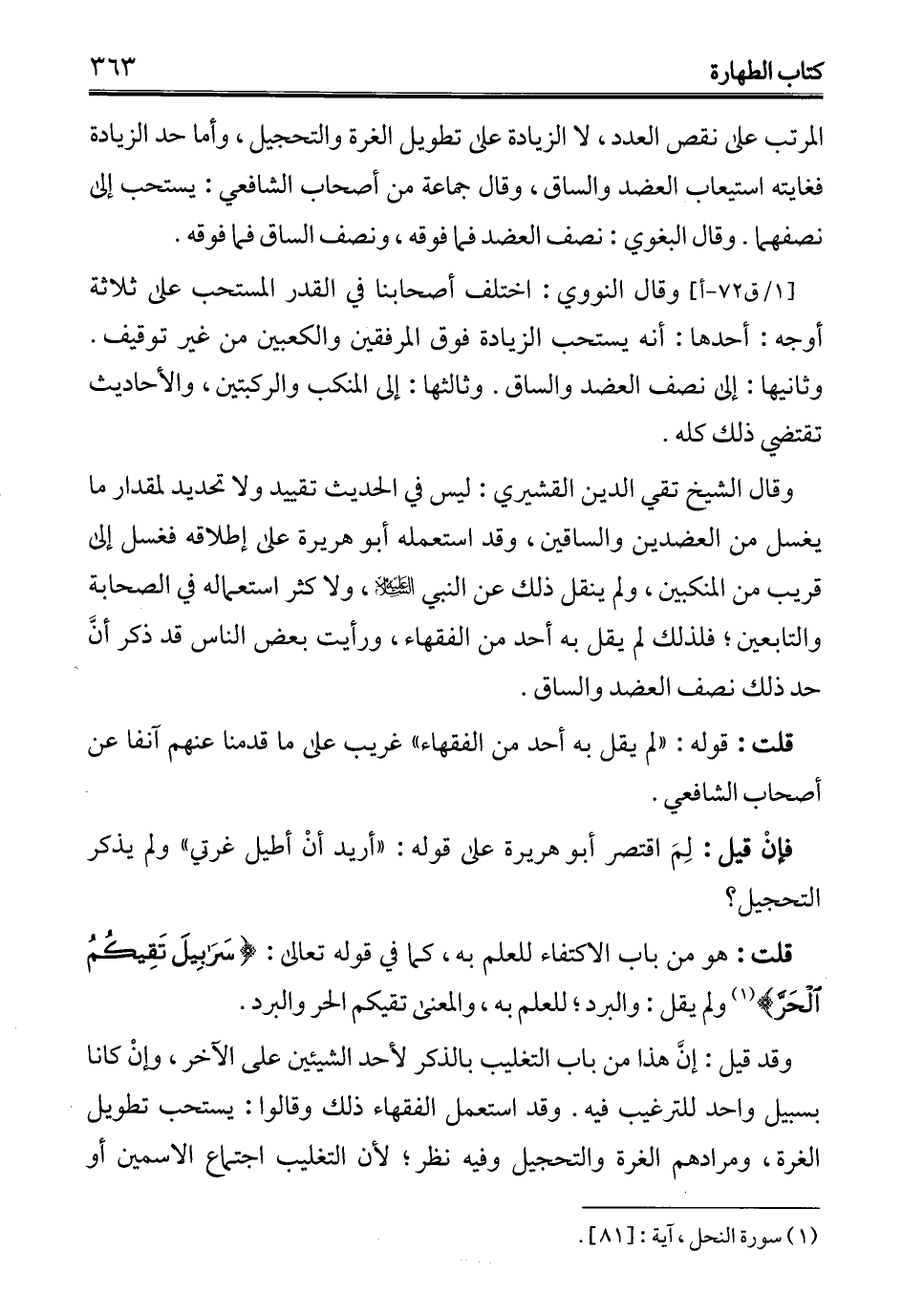 وقال الشيخ تقي الدين القشيري: ليس في الحديث تقييد ولا تحديد لمقدار ما يغسل من العضدين والساقين، وقد استعمله أبو هريرة على إطلاقه فغسل إلى قريب من المنكبين، ولم ينقل ذلك عن النبي - عليه السلام -، ولا كثر استعماله في الصحابة والتابعين؛ فلذلك لم يقل به أحد من الفقهاء، ورأيت بعض الناس قد ذكر أنَّ حد ذلك نصف العضد والساق.