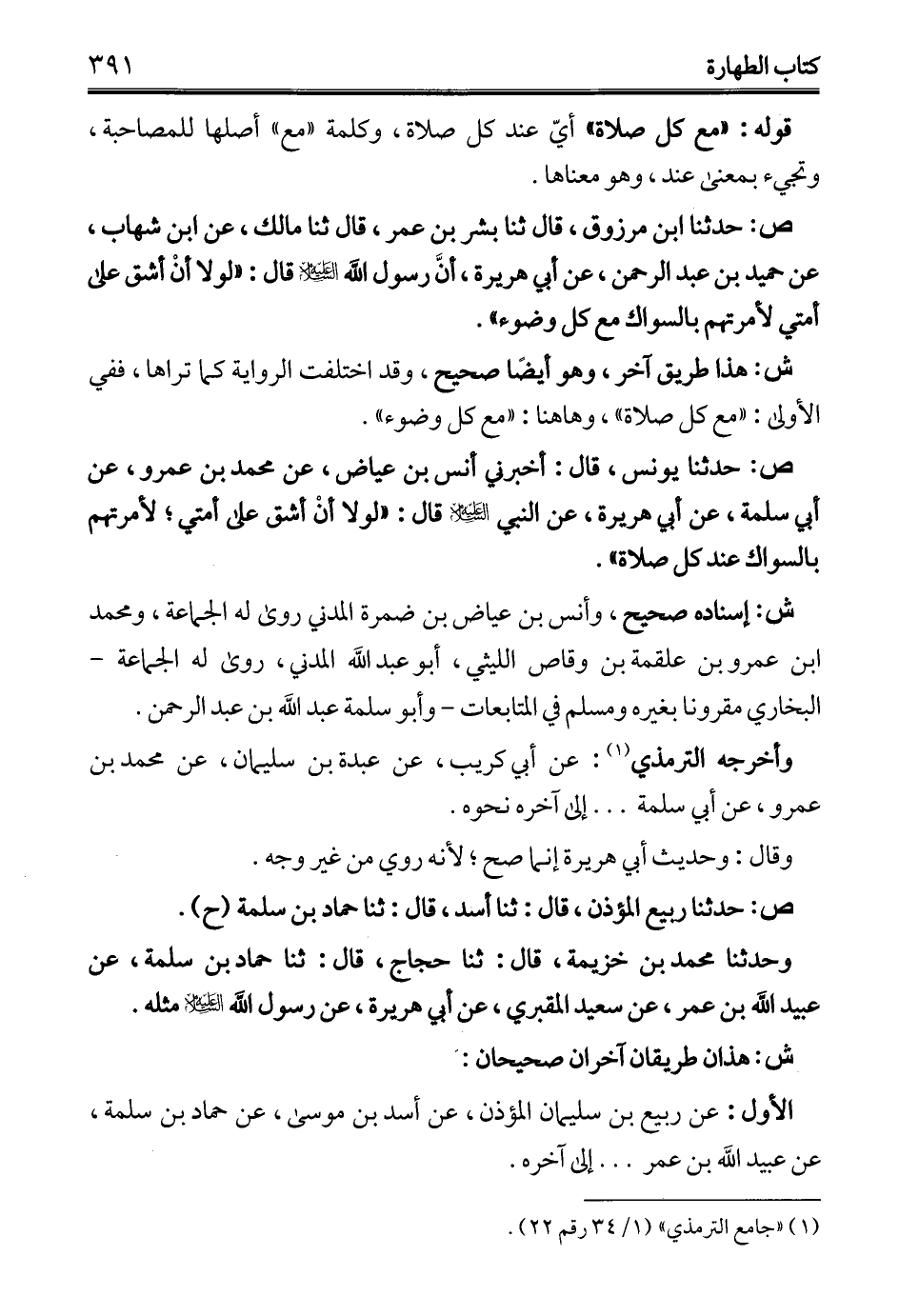 ص: حدثنا يونس، قال: أخبرني أنس بن عياض، عن محمَّد بن عمرو، عن أبي سلمة، عن أبي هريرة، عن النبي - عليه السلام - قال: "لولا أنْ أشق على أمتي. لأمرتهم بالسواك عند كل صلاة".