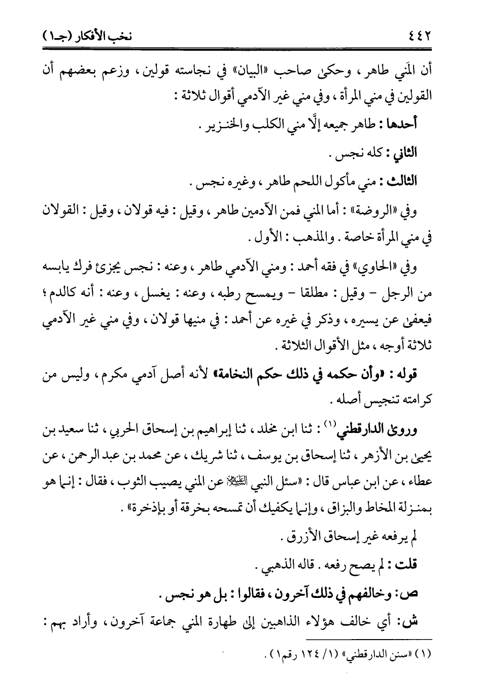 ش: أبي خالف هؤلاء الذاهبين إلى طهارة المني جماعة آخرون، وأراد بهم: