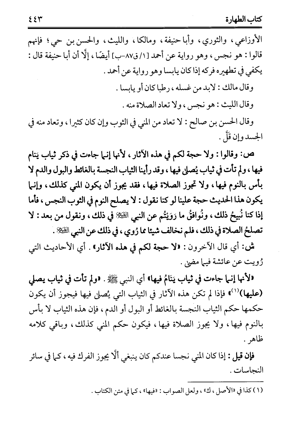 ص: وقالوا: ولا حجة لكم في هذه الآثار؛ لأنها إنما جاءت في ذكر ثياب يَنام فيها، ولم تأت في ثياب يُصلى فيها، وقد رأينا الثياب النجسة بالغائط والبول والدم لا بأس بالنوم فيها، ولا تجوز الصلاة فيها، فقد يجوز أن يكون المني كذلك، وإنما يكون هذا الحديث حجة علينا لو كنا نقول: لا يصلح النوم في الثوب النجس، فأما إذا كنا نُبيحُ ذلك، ونُوافقُ ما رَوَيْتُم عن النبي - عليه السلام - في ذلك، ونقى من بعد: لا تصلحُ الصلاة في ذلك، فلم نخالف شيئًا مما رُوي، في ذلك عن النبي - عليه السلام -.
