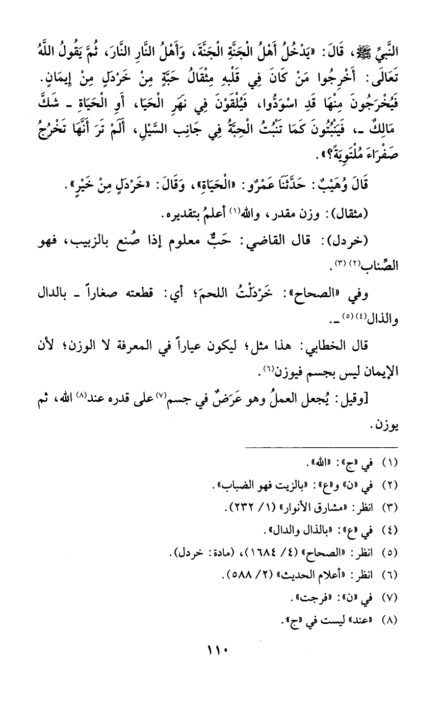 النَّبيِّ - صلى الله عليه وسلم -، قَالَ: "يَدْخُلُ أَهْلُ الْجَنَّةِ الْجَنَّةَ، وَأَهْلُ النَّارِ النَّارَ، ثُمَّ يَقُولُ اللَّهُ تَعَالَى: أَخْرِجُوا مَنْ كانَ فِي قَلْبهِ مِثْقَالُ حَبَّةٍ مِنْ خَرْدلٍ مِنْ إِيمَانٍ. فَيُخْرَجُونَ مِنْهَا قَدِ اسْوَدُّوا، فَيُلْقَوْنَ فِي نهرِ الْحَيَا، أَوِ الْحَيَاةِ -شَكَّ مَالِكٌ-، فَيَنْبُتُونَ كَمَا تَنْبُتُ الْحِبَّةُ فِي جَانِب السَّيْلِ، أَلَمْ تَرَ أَنَّهَا تَخْرُجُ صَفْرَاءَ مُلْتَوِيةً؟ ".
