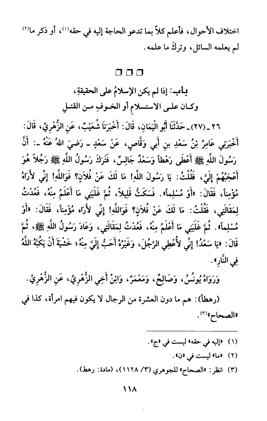 26 - (27) - حَدَّثَنَا أَبُو الْيَمَانِ، قَالَ: أَخْبَرَناَ شُعَيْبٌ، عَنِ الزُّهْرِيِّ، قَالَ: أَخْبَرَنِي عَامِرُ بْنُ سَعْدِ بنِ أَبي وَقَّاصٍ، عَنْ سَعْدٍ - رَضيَ اللَّهُ عَنْهُ -: أَنَّ رَسُولَ اللَّهِ - صلى الله عليه وسلم - أَعْطَى رَهْطًا وَسَعْدٌ جَالِسٌ، فَتَرَكَ رَسُولُ اللَّهِ - صلى الله عليه وسلم - رَجُلًا هُوَ أَعْجَبُهُمْ إِلَيَّ، فَقُلْتُ: يَا رَسُولَ اللَّهِ! مَا لَكَ عَنْ فُلاَنٍ؟ فَوَاللَّهِ! إِنَّي لأَرَاهُ مُؤْمِنًا، فَقَالَ: "أَوْ مُسْلِمًا". فَسَكَتُّ قَلِيلًا، ثُمَّ غَلَبَنِي مَا أَعْلَمُ مِنْهُ، فَعُدْتُ لِمَقَالَتِي، فَقُلْتُ: مَا لَكَ عَنْ فُلاَنٍ؟ فَوَاللَّهِ! إِنِّي لأَرَاه مُؤْمِنًا، فَقَالَ: "أَوْ مُسْلِمًا". ثُمَّ غَلَبَنِي مَا أَعْلَمُ مِنْهُ، فَعُدْتُ لِمَقَالَتِي، وَعَادَ رَسُولُ اللَّهِ - صلى الله عليه وسلم -، ثُمَّ قَالَ: "يَا سَعْدُ! إِنَّي لأُعْطِي الرَّجُلَ، وَغَيْرُهُ أَحَبُّ إِلَيَّ مِنْهُ؛ خَشْيَةَ أَنْ يَكُبَّهُ اللَّهُ فِي النَّارِ".