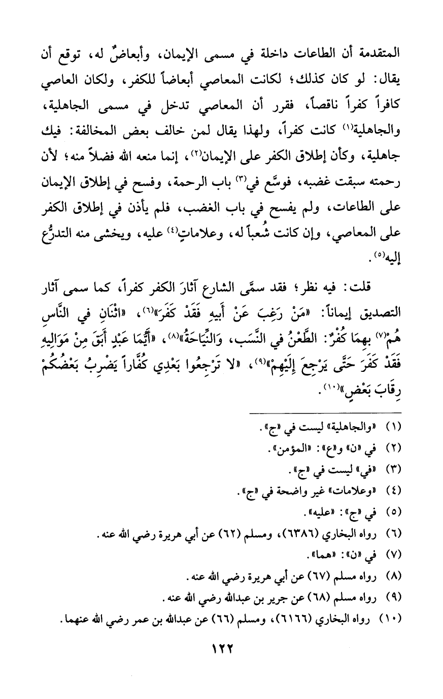 قلت: فيه نظر؛ فقد سمَّى الشارع آثارَ الكفر كفرًا، كما سمى آثار التصديق إيمانًا: "مَنْ رَغِبَ عَنْ أَبيهِ فَقَدْ كَفَرَ" (¬6)، "اثْنَانِ في النَّاسِ هُمْ (¬7) بهِمَا كُفْرٌ: الطَّعْنُ في النَّسَب، وَالنِّيَاحَةُ" (¬8)، "أَيُّمَا عَبْدٍ أَبَقَ مِنْ مَوَالِيهِ فَقَدْ كَفَرَ حَتَّى يَرْجِعَ إِلَيْهِمْ" (¬9)، "لا تَرْجِعُوا بَعْدِي كُفَّارًا يَضْرِبُ بَعْضُكُمْ رِقَابَ بَعْضٍ" (¬10).
