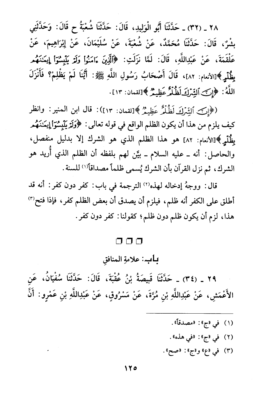 28 - (32) - حَدَّثَنَا أَبُو الْوَلِيدِ، قَالَ: حَدَّثَنَا شُعْبَةُ ح قَالَ: وَحَدَّثَنِي بشْرٌ، قَالَ: حَدَّثَنَا مُحَمَّدٌ، عَنْ شُعْبَةَ، عَنْ سُلَيْمَانَ، عَنْ إِبْرَاهِيمَ، عَنْ عَلْقَمَةَ، عَنْ عَبْدِ اللَّهِ، قَالَ: لَمَّا نزَلَتِ: {الَّذِينَ آمَنُوا وَلَمْ يَلْبِسُوا إِيمَانَهُمْ بِظُلْمٍ} [الأنعام: 82]، قَالَ أَصْحَابُ رَسُولِ اللَّهِ - صلى الله عليه وسلم -: أَيُّنَا لَمْ يَظْلِمْ؟ فَأَنْزَلَ اللَّهُ: {إِنَّ الشِّرْكَ لَظُلْمٌ عَظِيمٌ} [لقمان: 13].