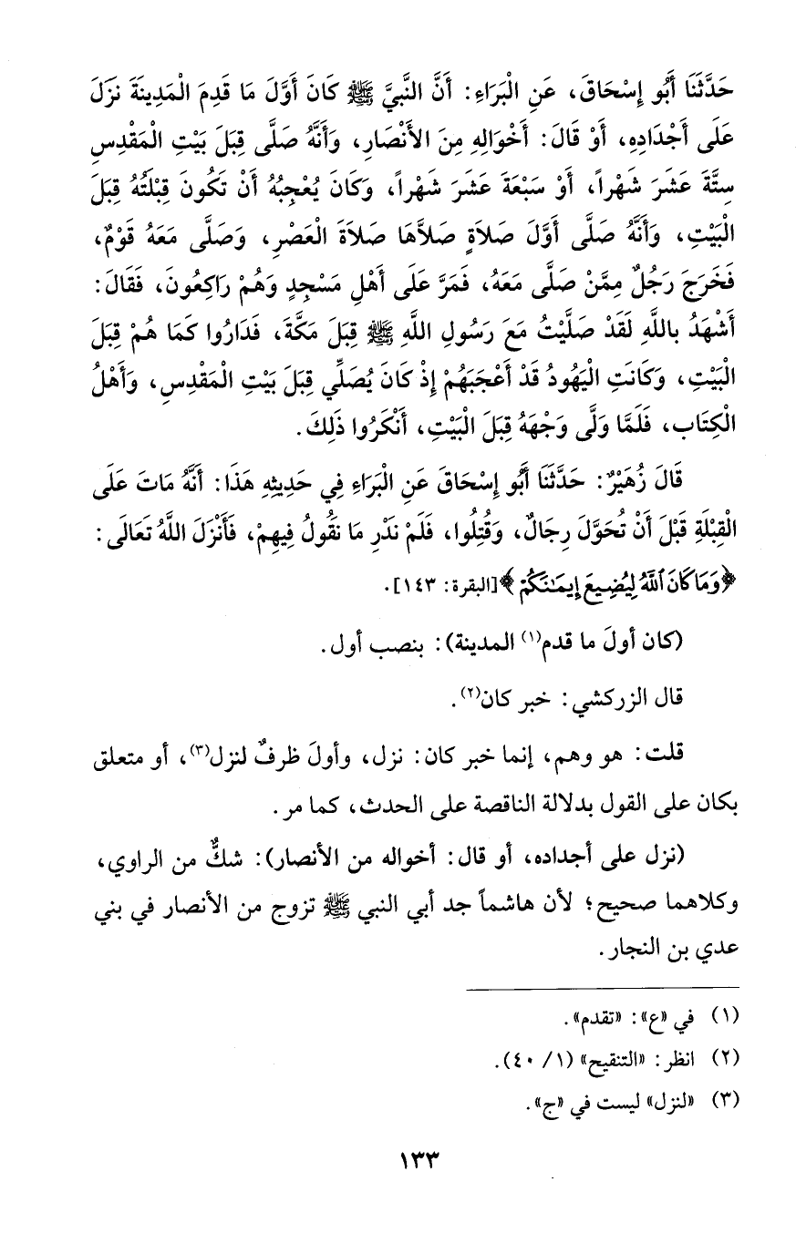 حَدَّثَنَا أَبُو إِسْحَاقَ، عَنِ الْبَرَاءِ: أَنَّ النَّبيَّ - صلى الله عليه وسلم - كَانَ أَوَّلَ مَا قَدِمَ الْمَدِينَةَ نَزَلَ عَلَى أَجْدَادِهِ، أَوْ قَالَ: أَخْوَالِهِ مِنَ الأَنْصَارِ، وَأَنَّهُ صَلَّى قِبَلَ بَيْتِ الْمَقْدِسِ سِتَّةَ عَشَرَ شَهْرًا، أَوْ سَبْعَةَ عَشَرَ شَهْرًا، وَكَانَ يُعْجِبُهُ أَنْ تَكُونَ قِبْلَتُهُ قِبَلَ الْبَيْتِ، وَأَنَّهُ صَلَّى أَوَّلَ صَلاَةٍ صَلَّاهَا صَلاَةَ الْعَصْرِ، وَصَلَّى مَعَهُ قَوْمٌ، فَخَرَجَ رَجُلٌ مِمَّنْ صَلَّى مَعَهُ، فمَرَّ عَلَى أَهْلِ مَسْجِدٍ وَهُمْ رَاكِعُونَ، فَقَالَ: أَشْهَدُ باللَّهِ لَقَدْ صَلَّيْتُ مَعَ رَسُولِ اللَّهِ - صلى الله عليه وسلم - قِبَلَ مَكَّةَ، فَدَارُوا كَمَا هُمْ قِبَلَ الْبَيْتِ، وَكَانَتِ الْيَهُودُ قَدْ أَعْجَبَهُمْ إِذْ كَانَ يُصَلِّي قِبَلَ بَيْتِ الْمَقْدِسِ، وَأَهْلُ الْكِتَاب، فَلَمَّا وَلَّى وَجْهَهُ قِبَلَ الْبَيْتِ، أَنْكَرُوا ذَلِكَ.