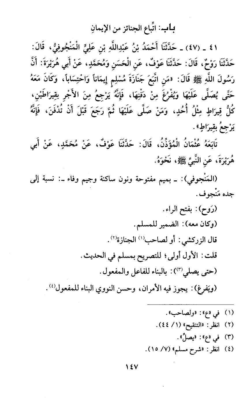 41 - (47) - حَدَّثَنَا أَحْمَدُ بْنُ عَبْدِ اللَّهِ بْنِ عَلِيٍّ الْمَنْجُوفِيُّ، قَالَ: حَدَّثَنَا رَوْحٌ، قَالَ: حَدَّثَنَا عَوْفٌ، عَنِ الْحَسَنِ وَمُحَمَّدٍ، عَنْ أَبي هُرَيْرَةَ: أَنَّ رَسُولَ اللَّهِ - صلى الله عليه وسلم - قَالَ: "مَنِ اتَّبَعَ جَنَازَةَ مُسْلِمٍ إِيمَانًا وَاحْتِسَابًا، وَكَانَ مَعَهُ حَتَّى يُصَلَّى عَلَيْهَا وَيُفْرُغَ مِنْ دَفْنِهَا، فَإِنَّهُ يَرْجِعُ مِنَ الأَجْرِ بقِيرَاطَيْنِ، كُلُّ قِيرَاطٍ مِثْلُ أُحُدٍ، وَمَنْ صَلَّى عَلَيْهَا ثُمَّ رَجَعَ قَبْلَ أَنْ تُدْفَنَ، فَإِنَّهُ يَرْجِعُ بقِيرَاطٍ".