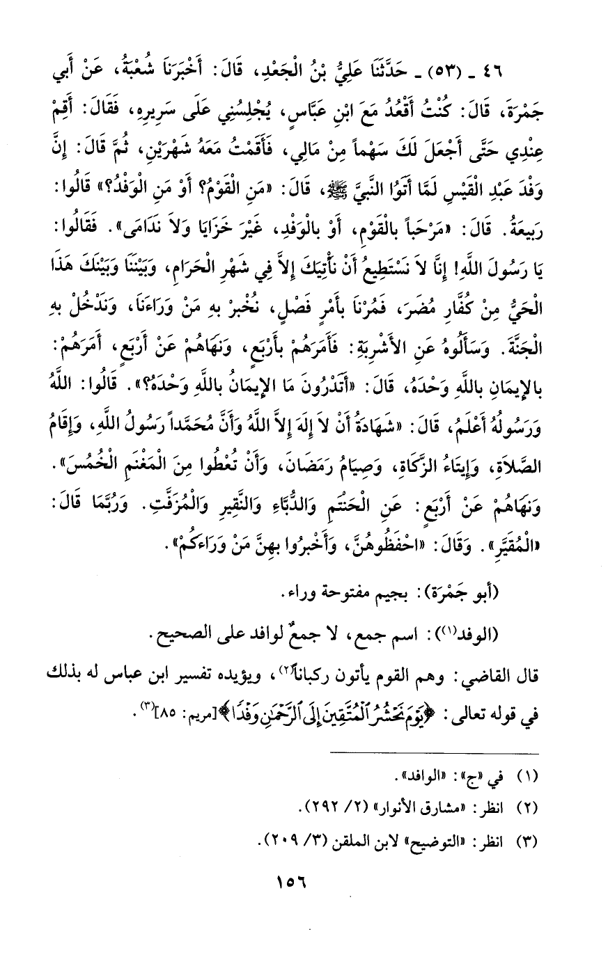 46 - (53) - حَدَّثَنَا عَلِيُّ بْنُ الْجَعْدِ، قَالَ: أَخْبَرَنَا شُعْبَةُ، عَنْ أَبي جَمْرَةَ، قَالَ: كُنْتُ أَقْعُدُ مَعَ ابْنِ عَبَّاسٍ، يُجْلِسُنِي عَلَى سَرِيرِهِ، فَقَالَ: أَقِمْ عِنْدِي حَتَّى أَجْعَلَ لَكَ سَهْمًا مِنْ مَالِي، فَأَقَمْتُ مَعَهُ شَهْرَيْنِ، ثُمَّ قَالَ: إِنَّ وَفْدَ عَبْدِ الْقَيْسِ لَمَّا أَتَوُا النَّبيَّ - صلى الله عليه وسلم -، قَالَ: "مَنِ الْقَوْمُ؟ أَوْ مَنِ الْوَفْدُ؟ " قَالُوا: رَبيعَةُ. قَالَ: "مَرْحَبًا بالْقَوْمِ، أَوْ بالْوَفْدِ، غَيْرَ خَزَايَا وَلاَ نَدَامَى". فَقَالُوا: يَا رَسُولَ اللَّهِ! إِنَّا لاَ نَسْتَطِيعُ أَنْ نَأْتِيَكَ إِلَّا فِي شَهْرِ الْحَرَامِ، وَبَيْنَنَا وَبَيْنَكَ هَذَا الْحَيُّ مِنْ كُفَّارِ مُضَرَ، فَمُرْنَا بأَمْرٍ فَصْلٍ، نُخْبرْ بهِ مَنْ وَرَاءَنَا، وَنَدْخُلْ بهِ الْجَنَّةَ. وَسَأَلُوهُ عَنِ الأَشْرِبَةِ: فَأَمَرَهُمْ بأَرْبَعٍ، وَنَهَاهُمْ عَنْ أَرْبَعٍ، أَمَرَهُمْ: بالإِيمَانِ باللَّهِ وَحْدَهُ، قَالَ: "أَتَدْرُونَ مَا الإيمَانُ باللَّهِ وَحْدَهُ؟ ". قَالُوا: اللَّهُ وَرَسُولُهُ أَعْلَمُ، قَالَ: "شَهَادَةُ أَنْ لاَ إِلَهَ إِلَّا اللَّهُ وَأَنَّ مُحَمَّدًا رَسُولُ اللَّهِ، وَإِقَامُ الصَّلاَةِ، وَإِيتَاءُ الزَّكَاةِ، وَصِيَامُ رَمَضَانَ، وَأَنْ تُعْطُوا مِنَ الْمَغْنَمِ الْخُمُسَ". وَنَهَاهُمْ عَنْ أَرْبَعٍ: عَنِ الْحَنْتَمِ وَالدُّبَّاءِ وَالنَّقِيرِ وَالْمُزَفَّتِ. وَرُبَّمَا قَالَ: "الْمُقَيَّرِ". وَقَالَ: "احْفَظُوهُنَّ، وَأَخْبرُوا بهِنَّ مَنْ وَرَاءَكُمْ".
