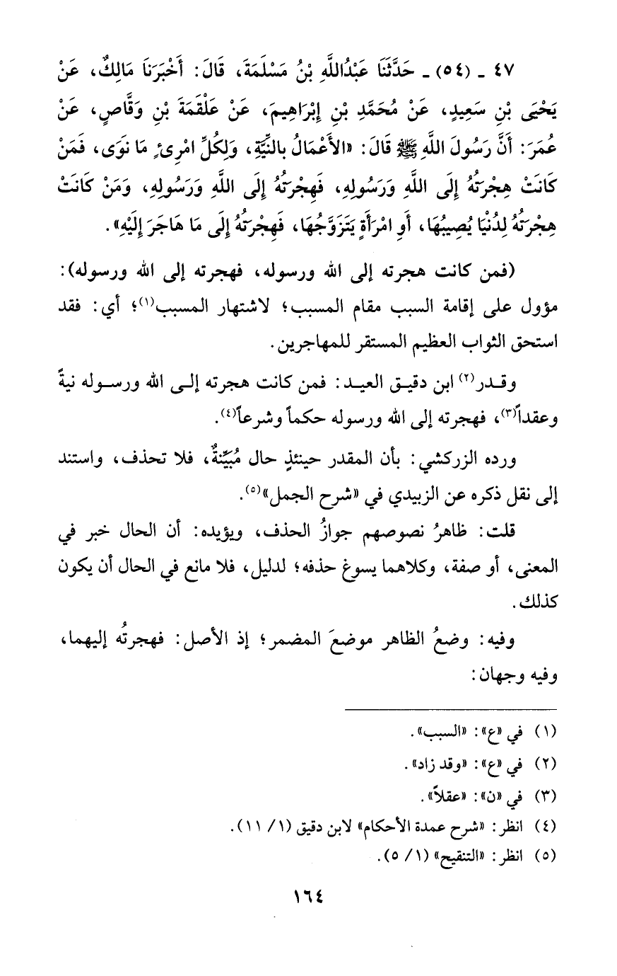 47 - (54) - حَدَّثَنَا عَبْدُ اللَّهِ بْنُ مَسْلَمَةَ، قَالَ: أَخْبَرَنَا مَالِكٌ، عَنْ يَحْيَى بْنِ سَعِيدٍ، عَنْ مُحَمَّدِ بْنِ إِبْرَاهِيمَ، عَنْ عَلْقَمَةَ بْنِ وَقَّاصٍ، عَنْ عُمَرَ: أَنَّ رَسُولَ اللَّهِ - صلى الله عليه وسلم - قَالَ: "الأَعْمَالُ بالنِّيَّةِ، وَلِكُلِّ امْرِئٍ مَا نَوَى، فَمَنْ كَانَتْ هِجْرَتُهُ إِلَى اللَّهِ وَرَسُولِهِ، فَهِجْرَتُهُ إِلَى اللَّهِ وَرَسُولِهِ، وَمَنْ كَانَتْ هِجْرَتُهُ لِدُنْيَا يُصِيبُهَا، أَوِ امْرَأَةٍ يَتَزَوَّجُهَا، فَهِجْرَتُهُ إِلَى مَا هَاجَرَ إِلَيْهِ".