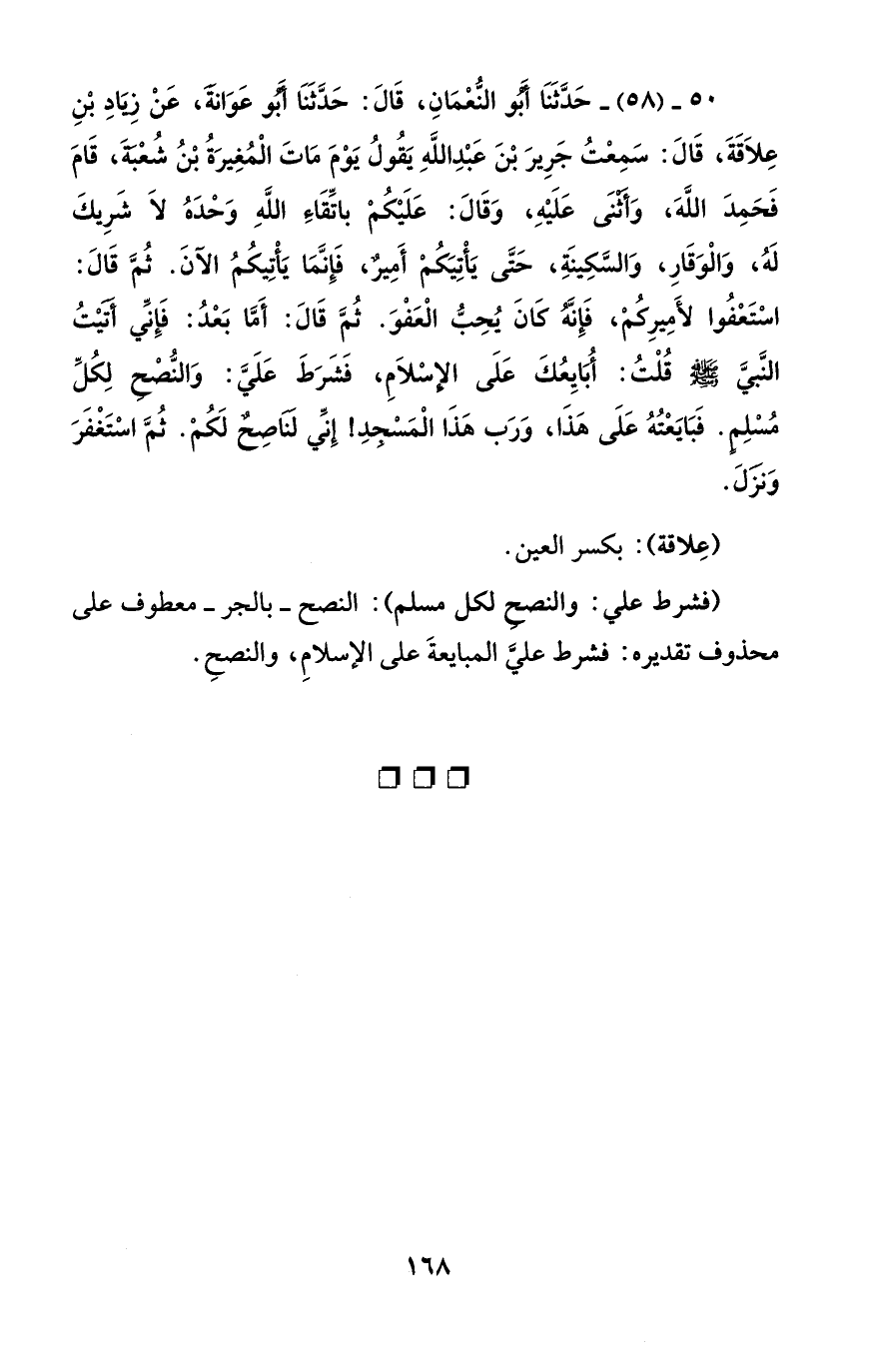 50 - (58) - حَدَّثَنَا أَبُو النُّعْمَانِ، قَالَ: حَدَّثَنَا أَبُو عَوَانَةَ، عَنْ زِيَادِ بْنِ عِلاَقَةَ، قَالَ: سَمِعْتُ جَرِيرَ بْنَ عَبْدِ اللَّهِ يَقُولُ يَوْمَ مَاتَ الْمُغِيرَةُ بْنُ شُعْبَةَ، قَامَ فَحَمِدَ اللَّهَ، وَأَثْنَى عَلَيْهِ، وَقَالَ: عَلَيْكُمْ باتِّقَاءِ اللَّهِ وَحْدَهُ لاَ شَرِيكَ لَهُ، وَالْوَقَارِ، وَالسَّكِينَةِ، حَتَّى يَأْتِيَكُمْ أَمِيرٌ، فَإِنَّمَا يَأْتِيكُمُ الآنَ. ثُمَّ قَالَ: اسْتَعْفُوا لأَمِيرِكُمْ، فَإِنَّهُ كَانَ يُحِبُّ الْعَفْوَ. ثُمَّ قَالَ: أَمَّا بَعْدُ: فَإِنِّي أَتَيْتُ النَّبيَّ - صلى الله عليه وسلم - قُلْتُ: أُبَايِعُكَ عَلَى الإِسْلاَمِ، فشَرَطَ عَلَيَّ: وَالنُّصْحِ لِكُلِّ مُسْلِمٍ. فَبَايَعْتُهُ عَلَى هَذَا، وَرَب هَذَا الْمَسْجدِ! إِنِّي لَنَاصِحٌ لَكُمْ. ثُمَّ اسْتَغْفَرَ وَنَزَلَ.