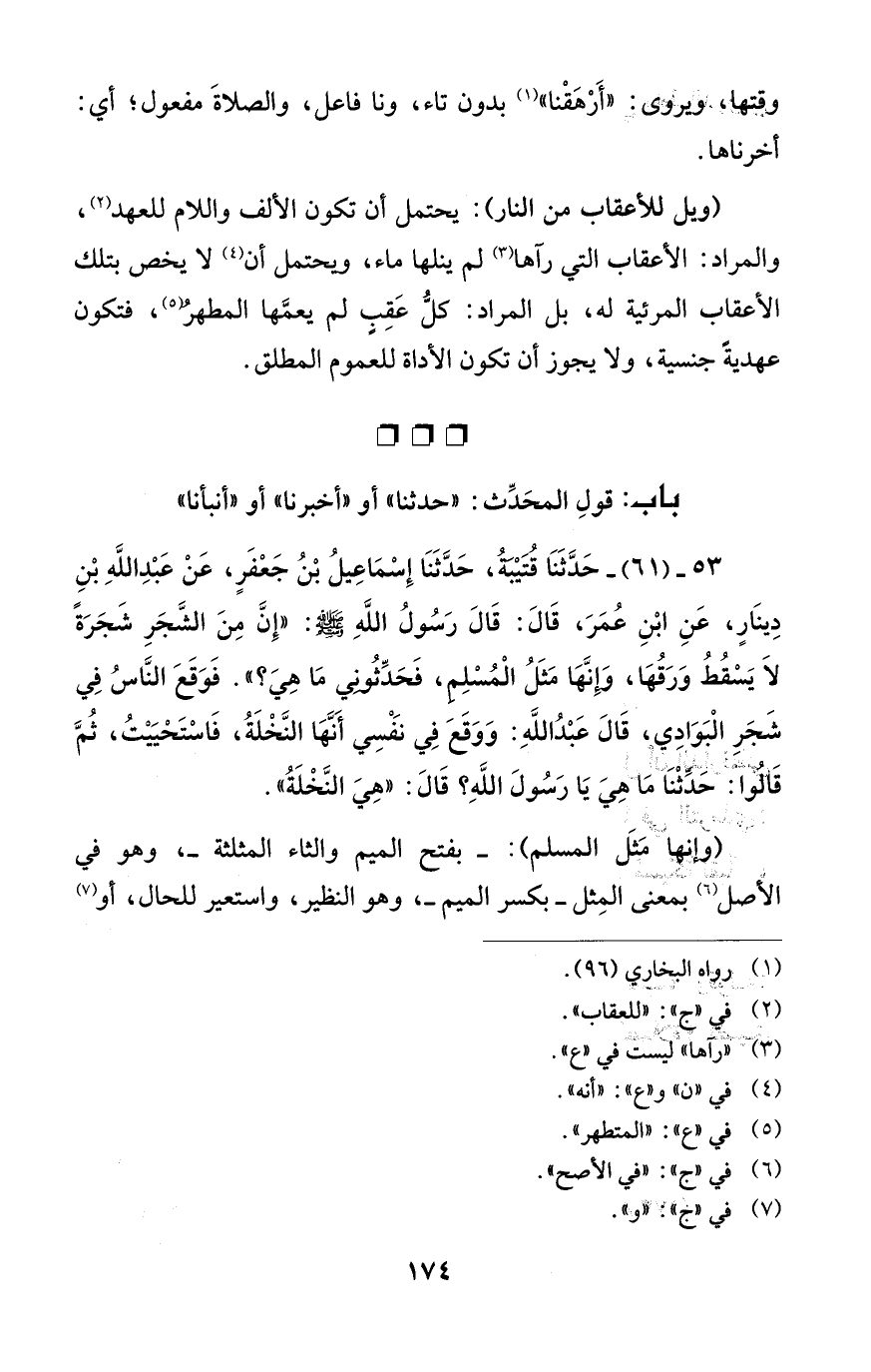 53 - (61) - حَدَّثَنَا قُتَيْبَةُ، حَدَّثَنَا إِسْمَاعِيلُ بْنُ جَعْفَرٍ، عَنْ عَبْدِ اللَّهِ بْنِ دِينَارٍ، عَنِ ابْنِ عُمَرَ، قَالَ: قَالَ رَسُولُ اللَّهِ - صلى الله عليه وسلم -: "إِنَّ مِنَ الشَّجَرِ شَجَرَةً لاَ يَسْقُطُ وَرَقُهَا، وَإِنَّهَا مَثَلُ الْمُسْلِمِ، فَحَدِّثُونِي مَا هِيَ؟ ". فَوَقَعَ النَّاسُ فِي شَجَرِ الْبَوَادِي، قَالَ عَبْدُ اللَّهِ: وَوَقَعَ فِي نَفْسِي أَنَّهَا النَّخْلَةُ، فَاسْتَحْيَيْتُ، ثُمَّ قَالُوا: حَدِّثْنَا مَا هِيَ يَا رَسُولَ اللَّهِ؟ قَالَ: "هِيَ النَّخْلَةُ".